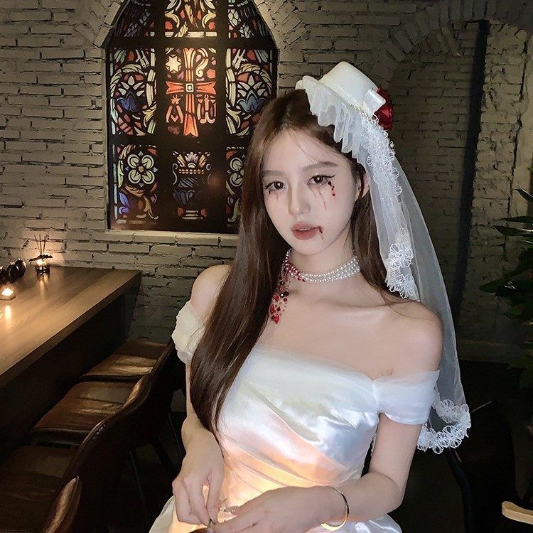 サタンの女 ~ バラのレースのベールの帽子のゴシックのハロウィンのcosは写真を撮ります。