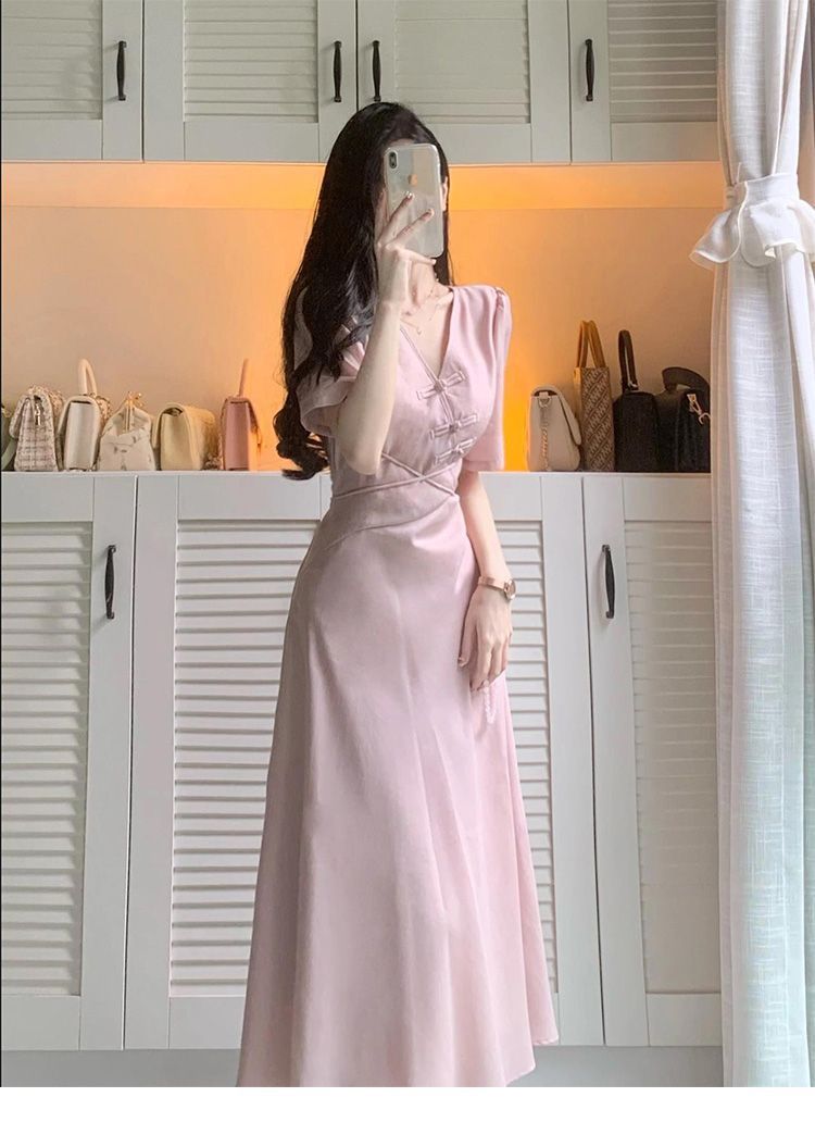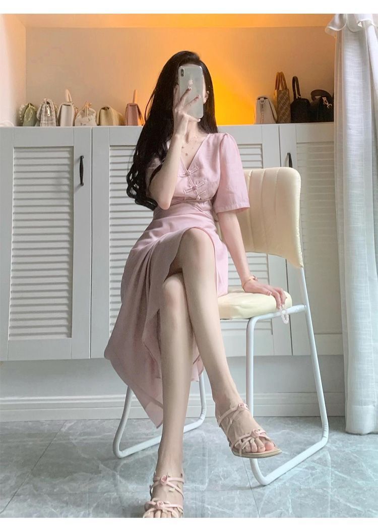 9301 レトロバックルレース中国風改良チャイナドレス中国風ミディアムドレス 2025 半袖新しい婦人服