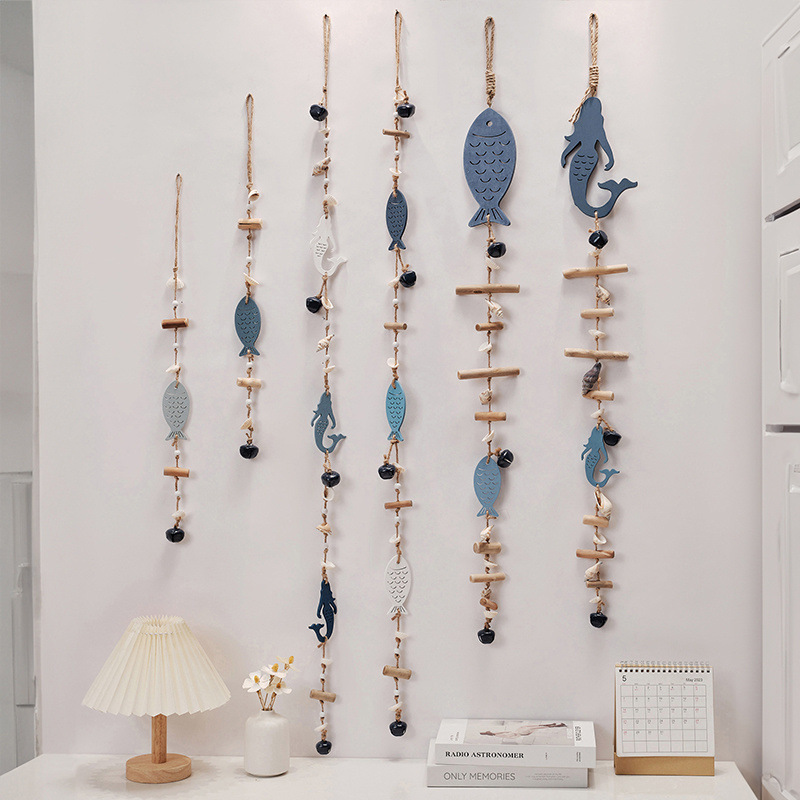地中海风格墙面装饰品鱼串铃铛挂件实木麻绳风铃创意北欧墙壁家居