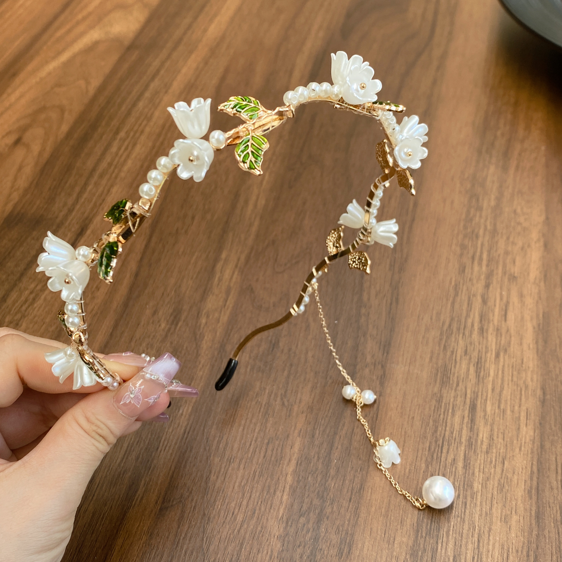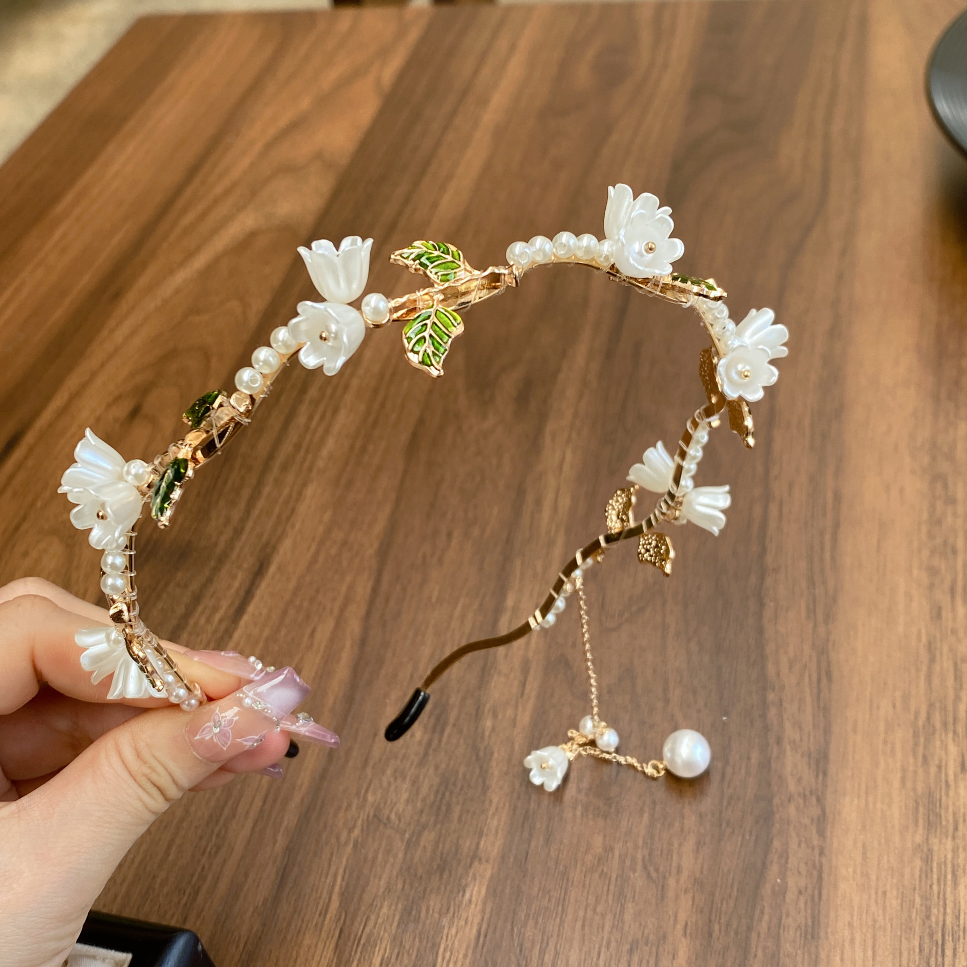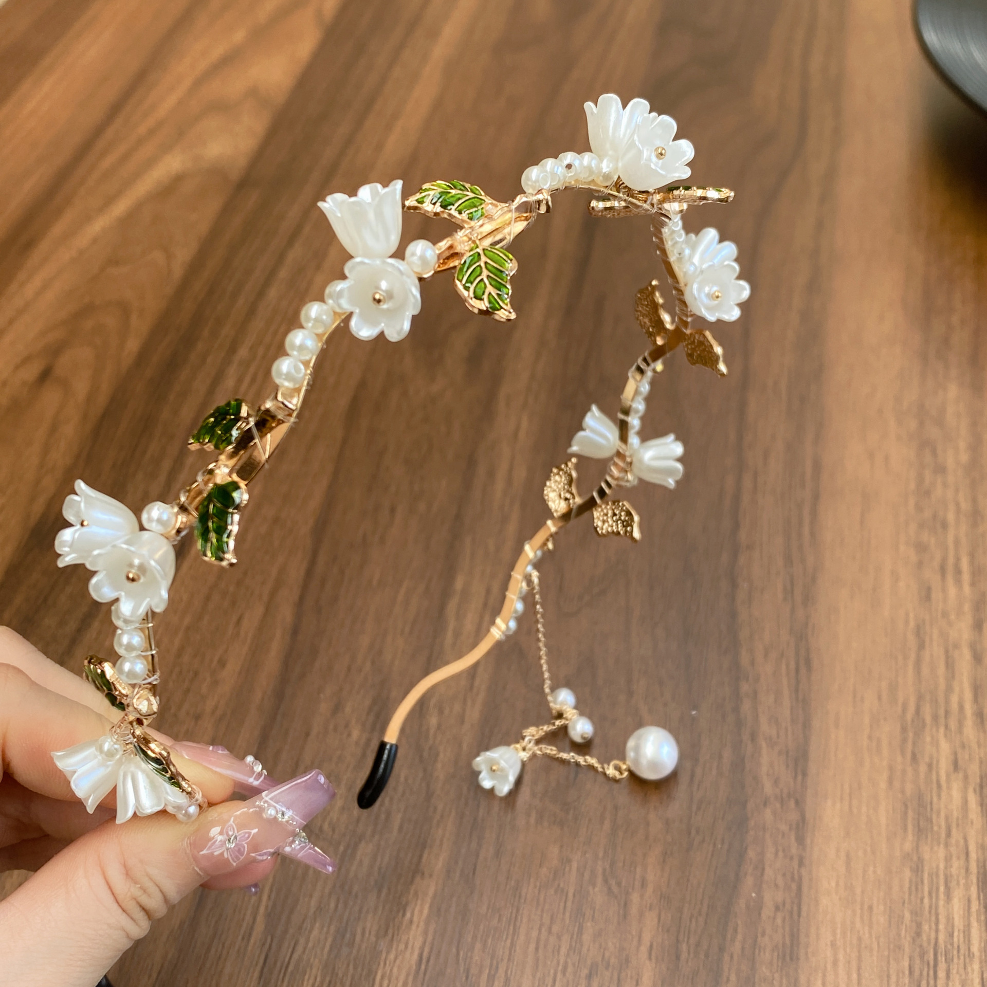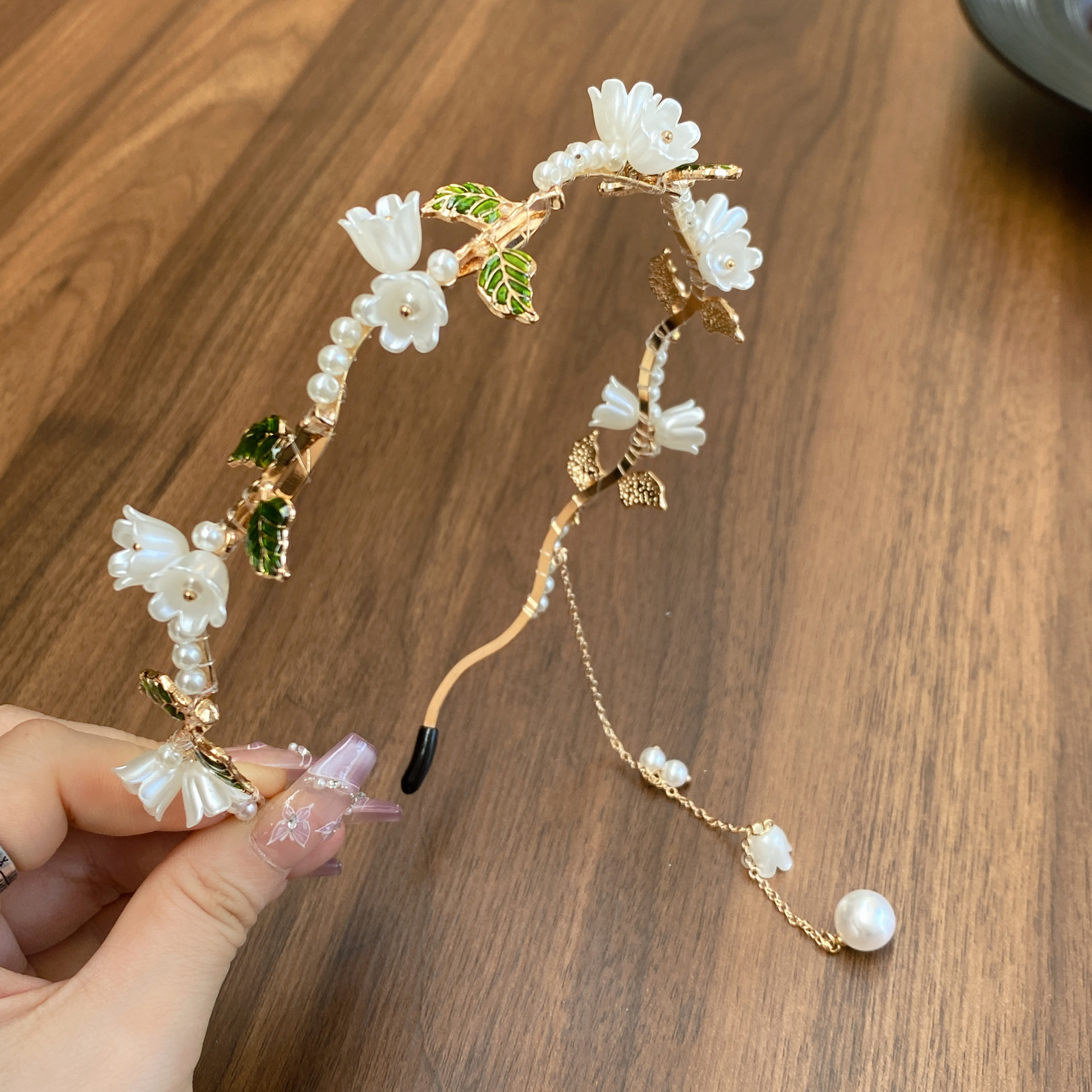 レトロなスタイルのスズランの花パールタッセル耳掛けヘッドバンド女性の妖精スタイルのハイエンドヘッドバンドヘアピンヘアアクセサリー