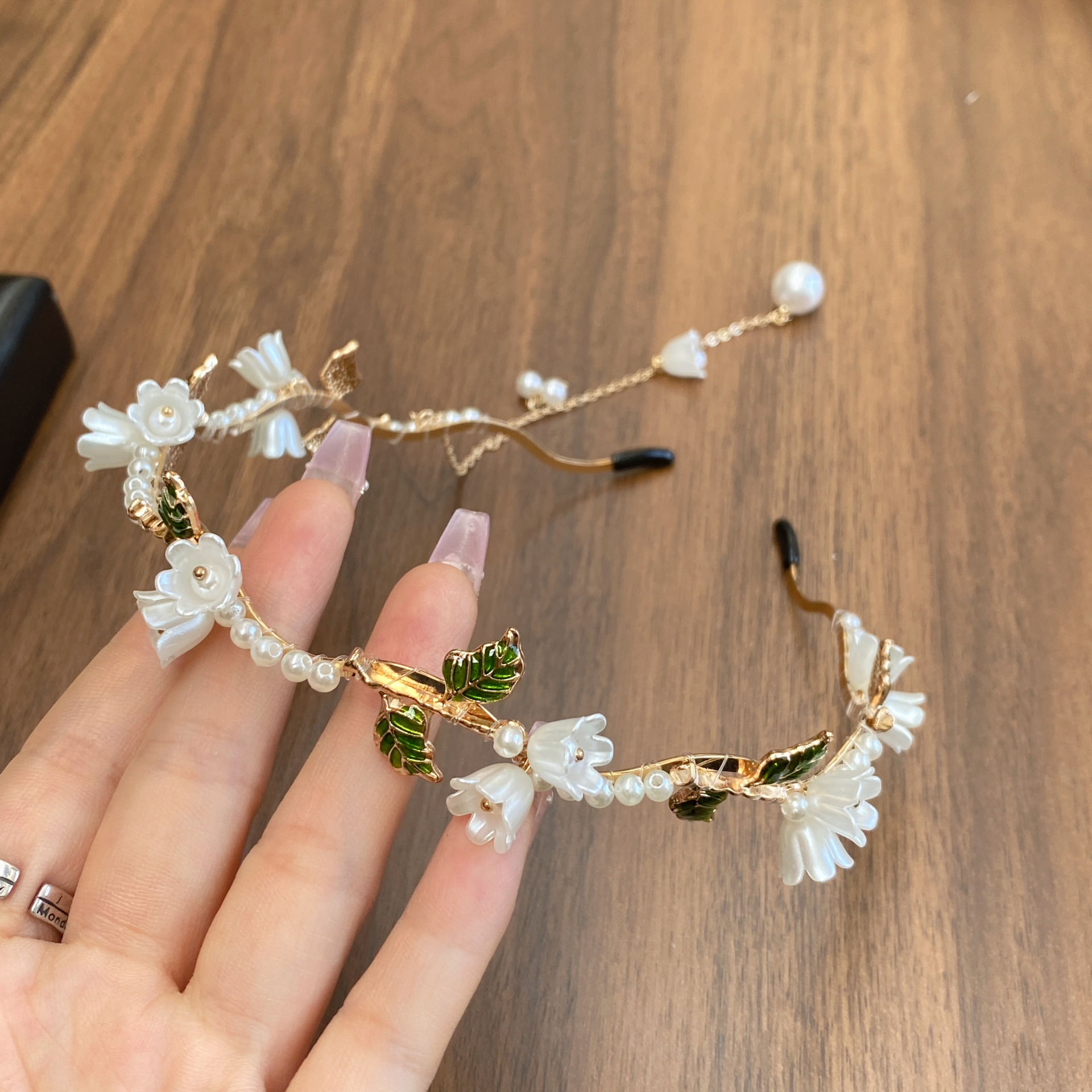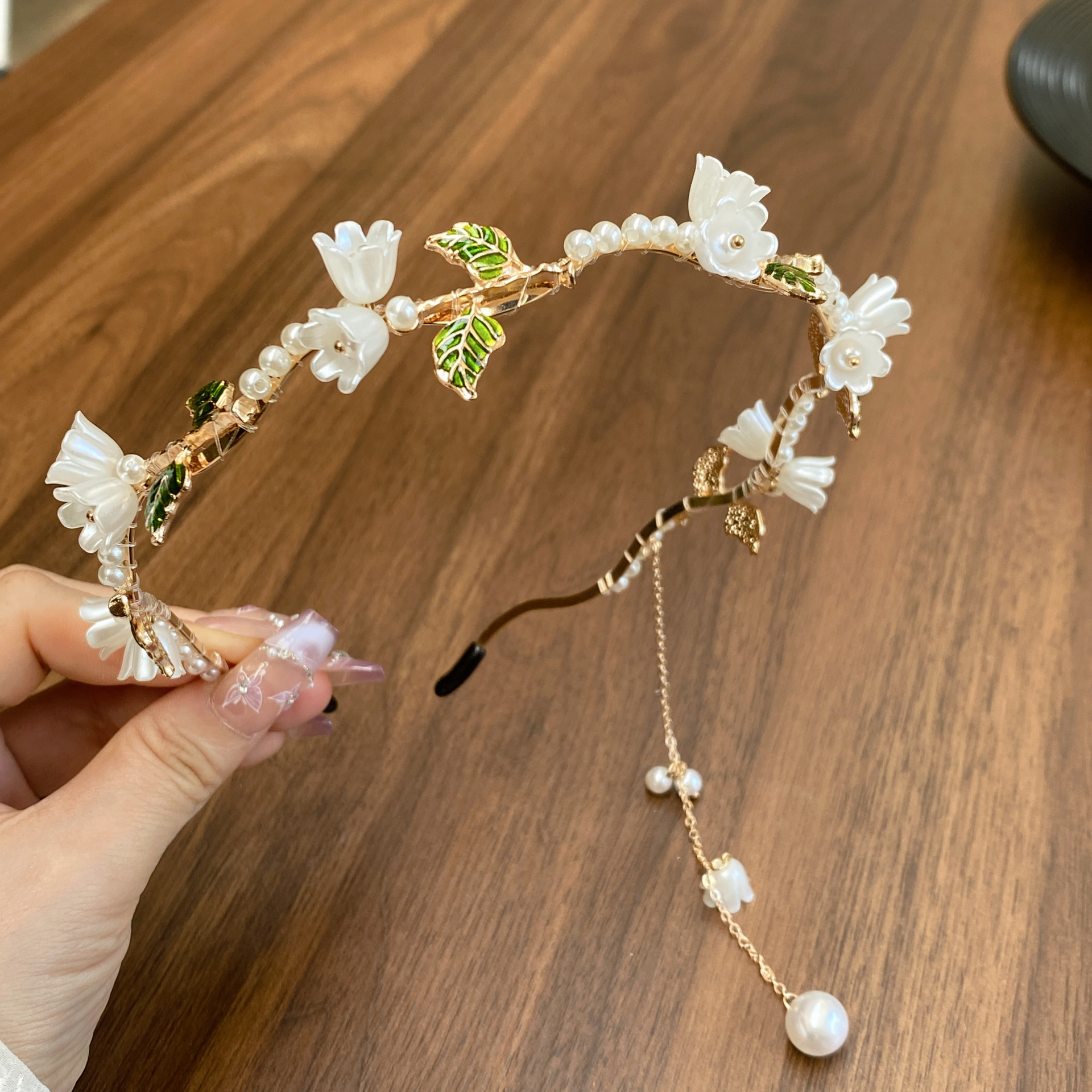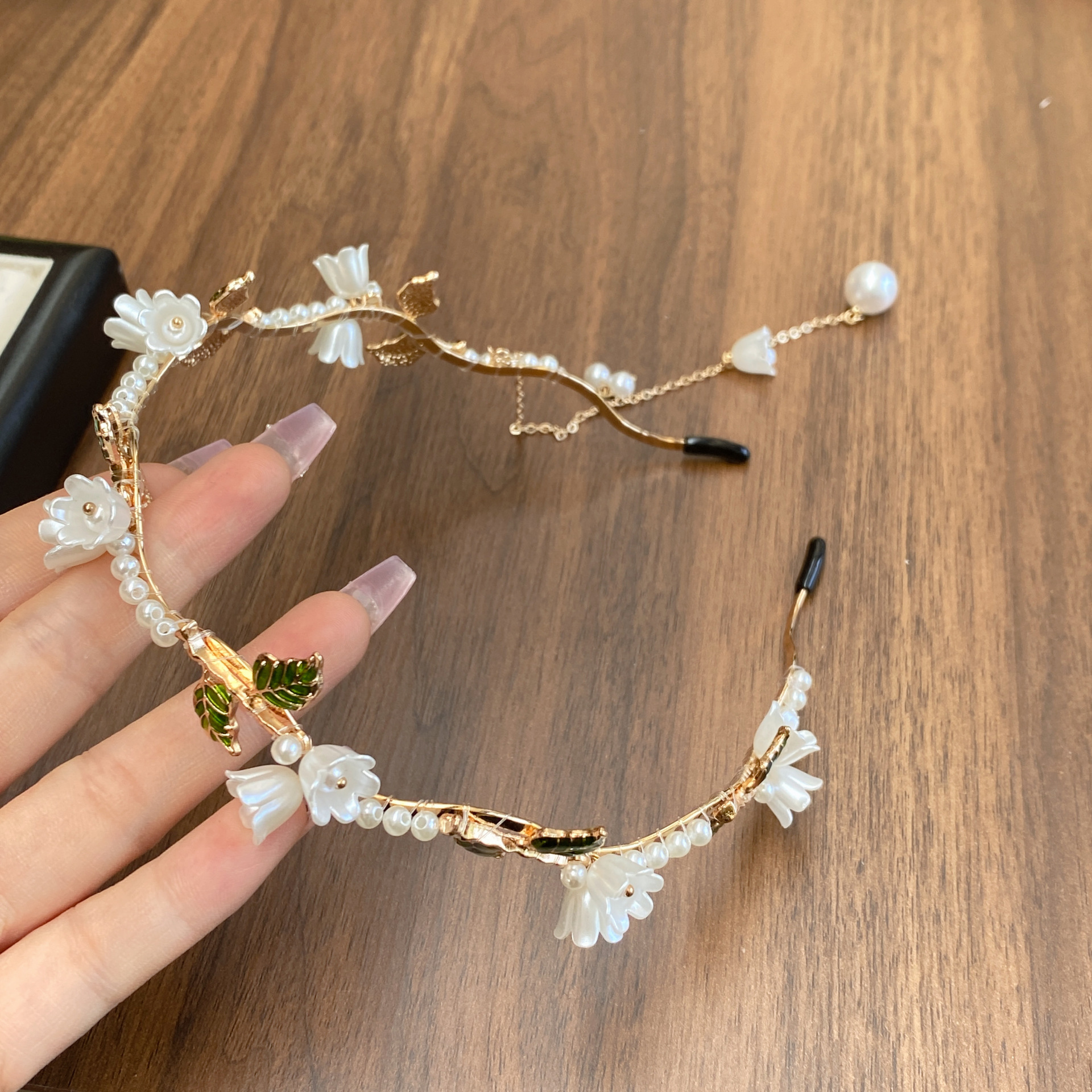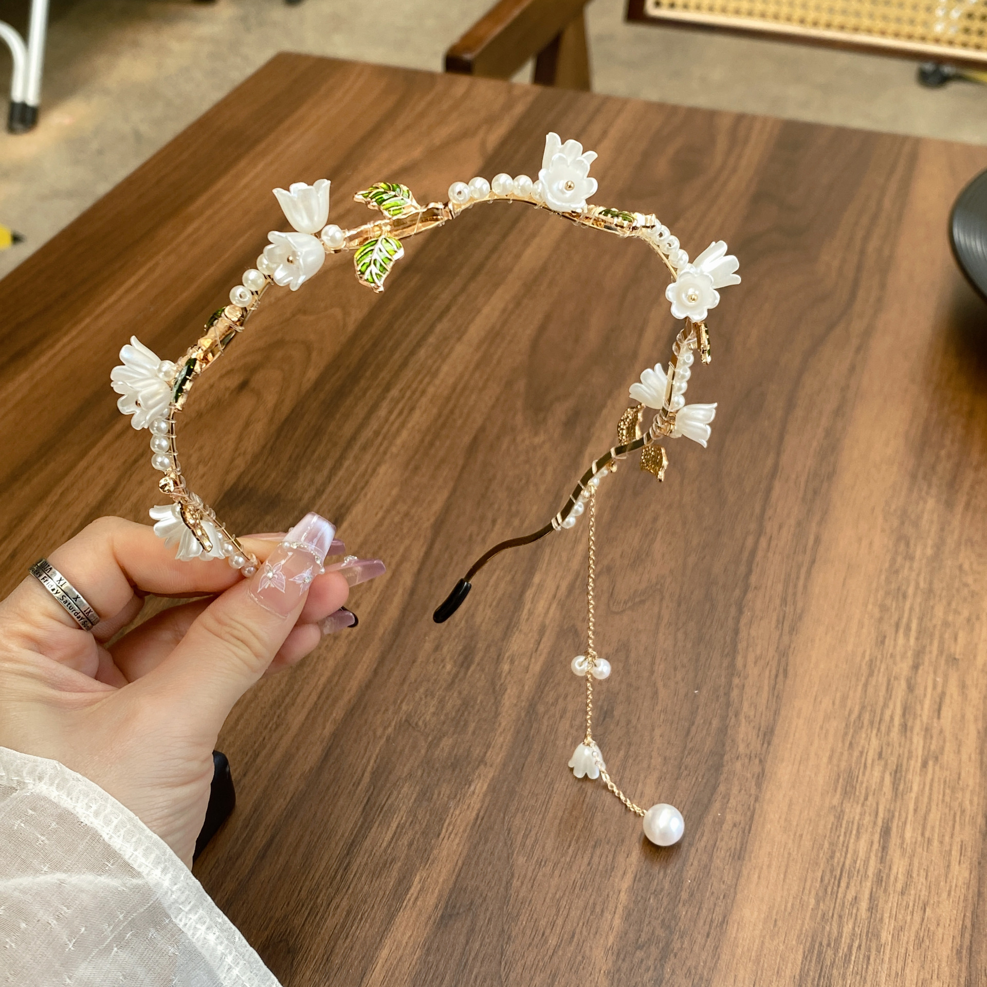 レトロなスタイルのスズランの花パールタッセル耳掛けヘッドバンド女性の妖精スタイルのハイエンドヘッドバンドヘアピンヘアアクセサリー