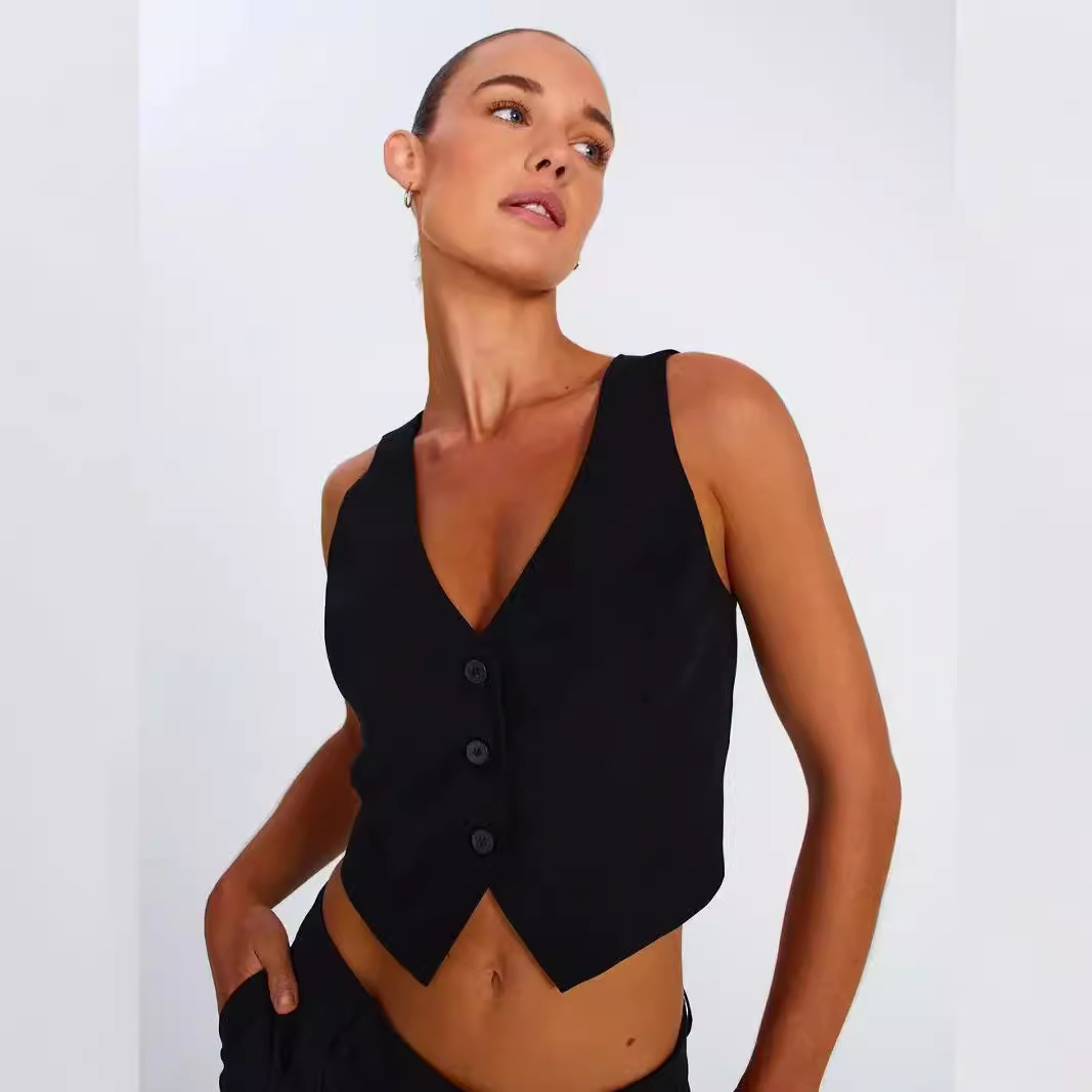 在庫あり 2025 夏の新スタイルヨーロッパとアメリカのクロスボーダー無地ノースリーブローズボタンスリムベスト気質通勤