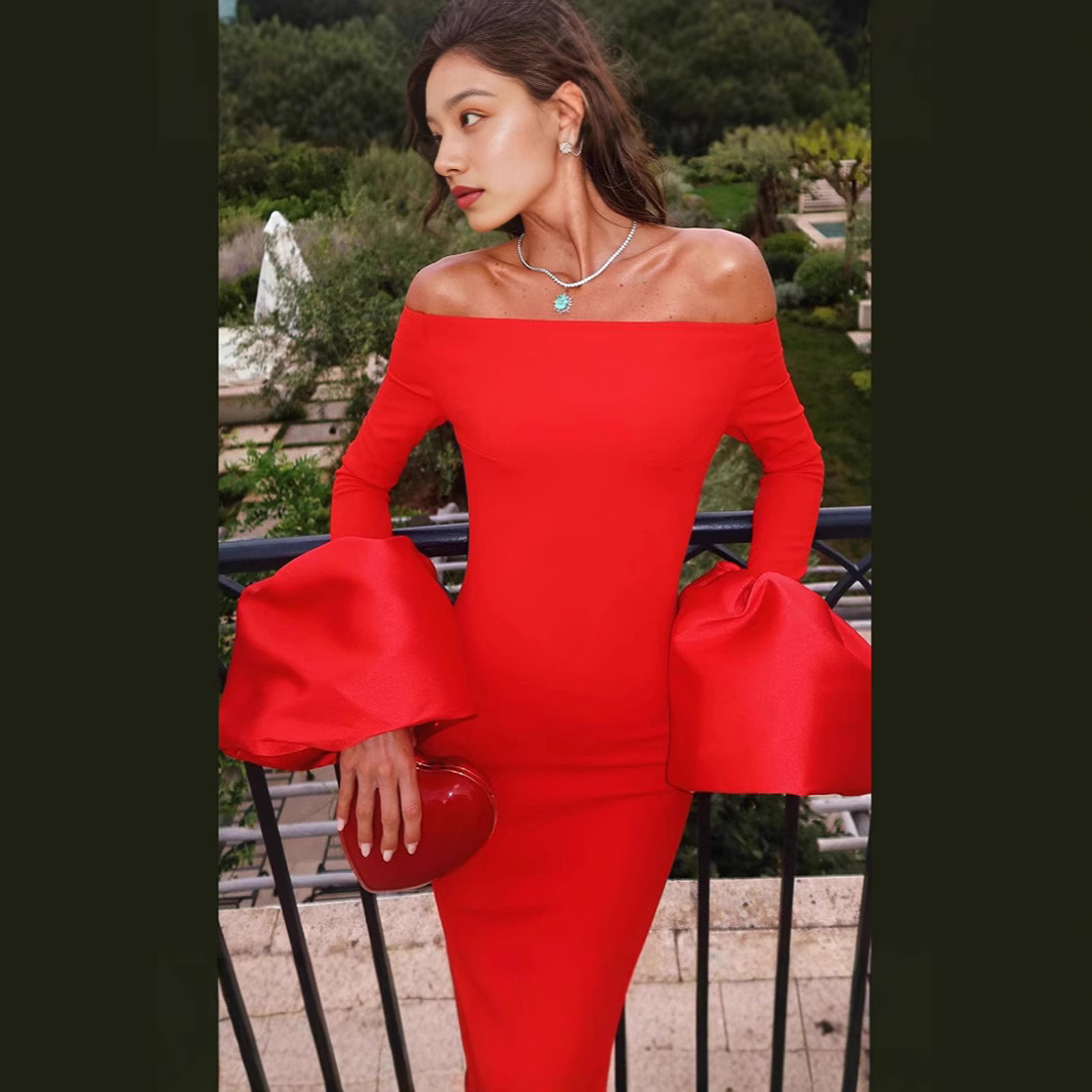欧米の婦人服2024秋冬の新型ファッションの一字襟のつぼみの袖の長袖は身を修めてフォークの長いスカートのワンピースを開きます。