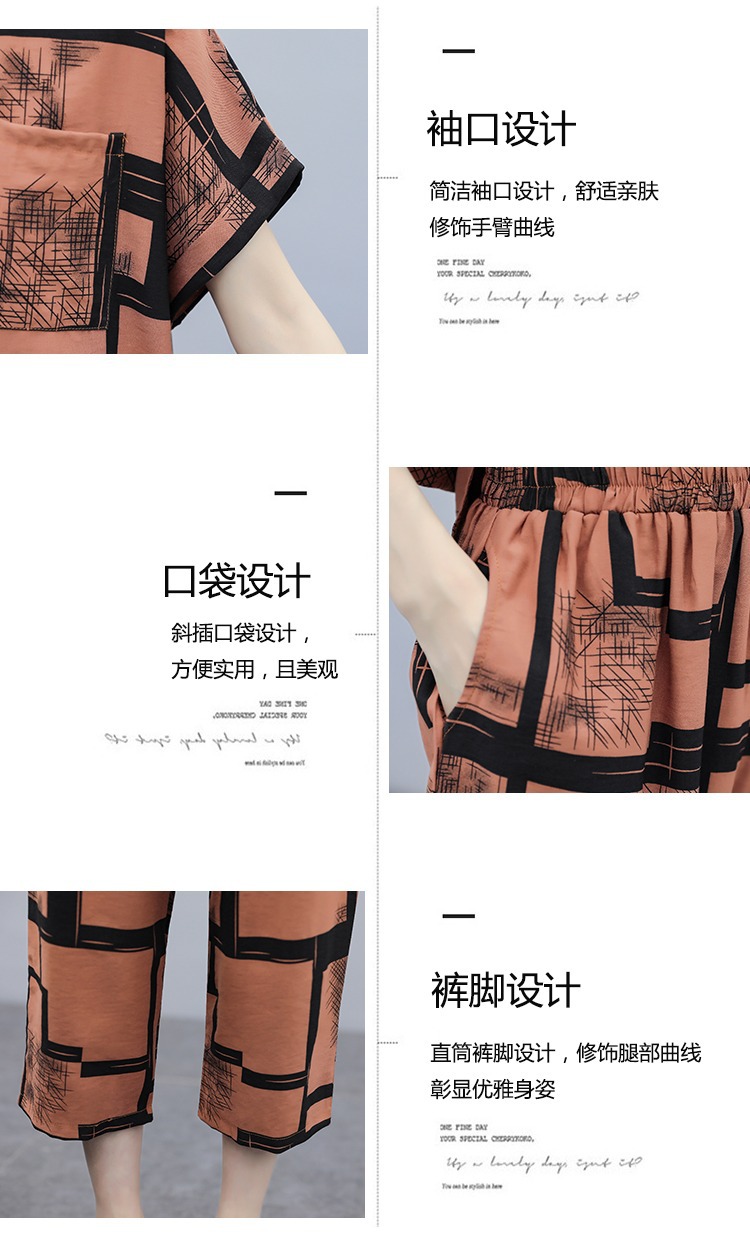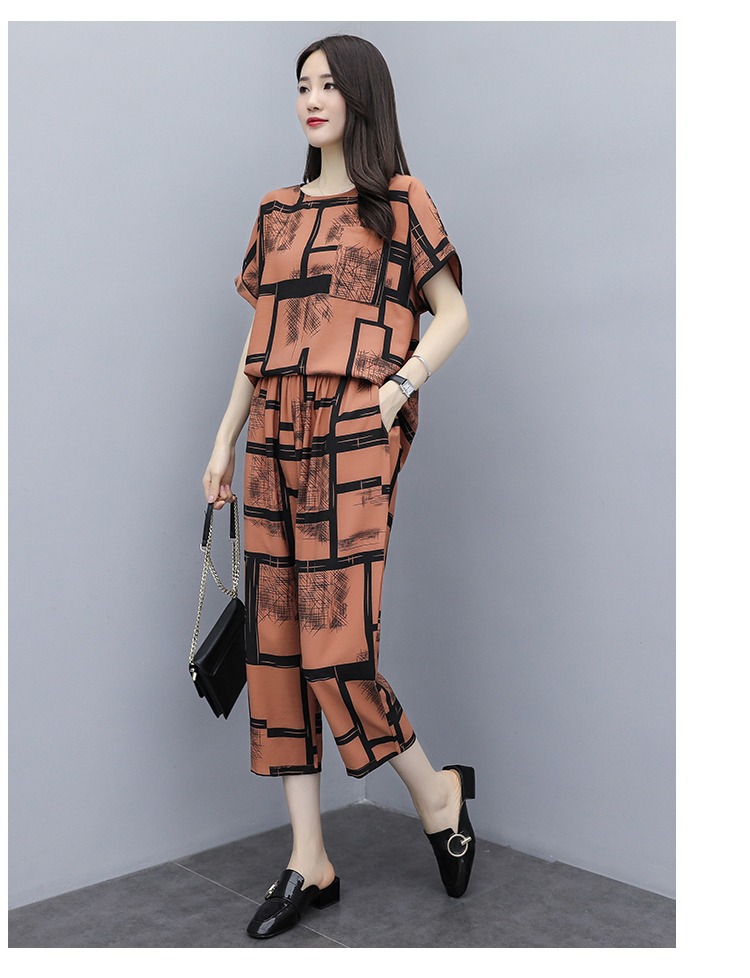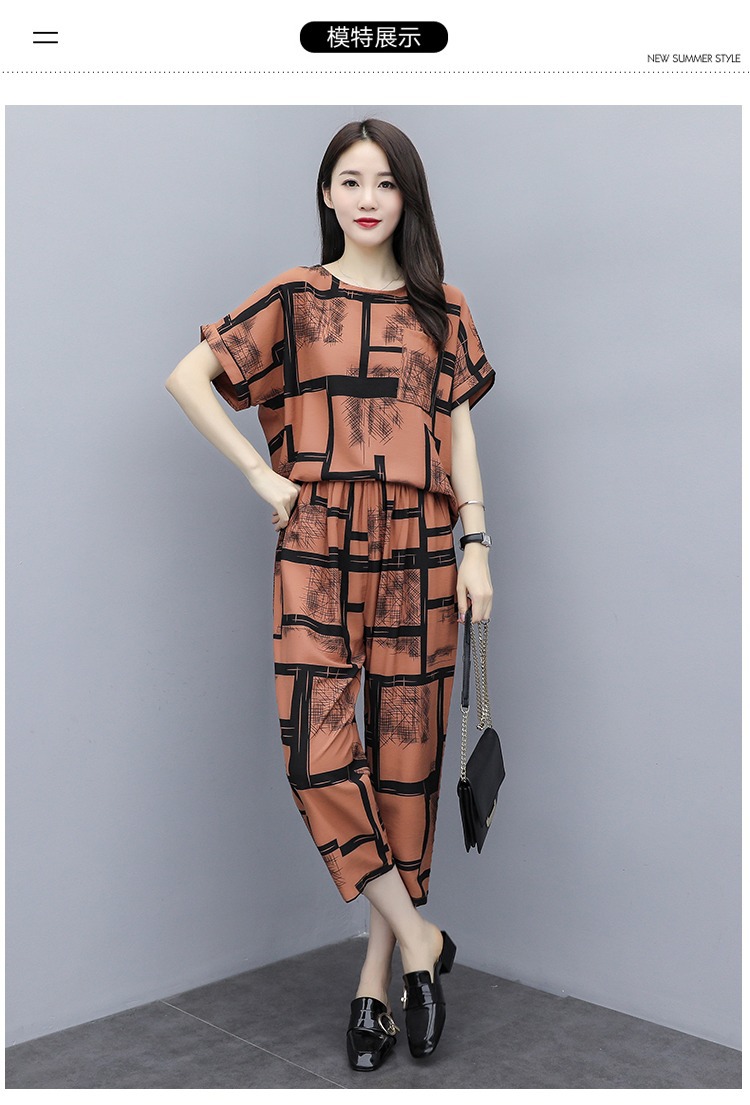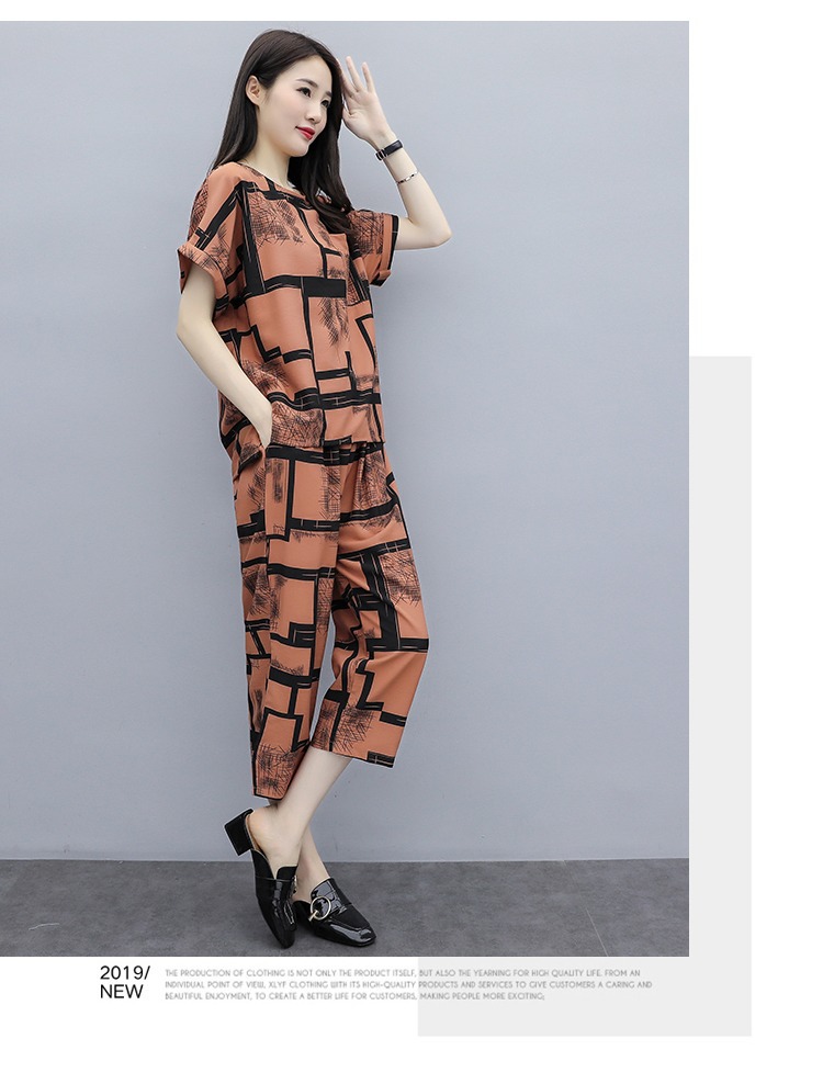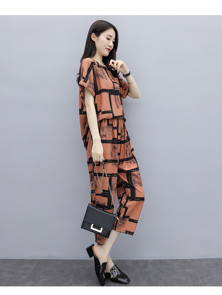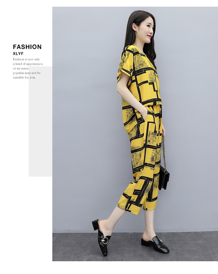 おしゃれな半袖スーツ 2025 夏プリントゆったり痩身大きいサイズレディースカジュアル七分ハーレムパンツ 2 点セット