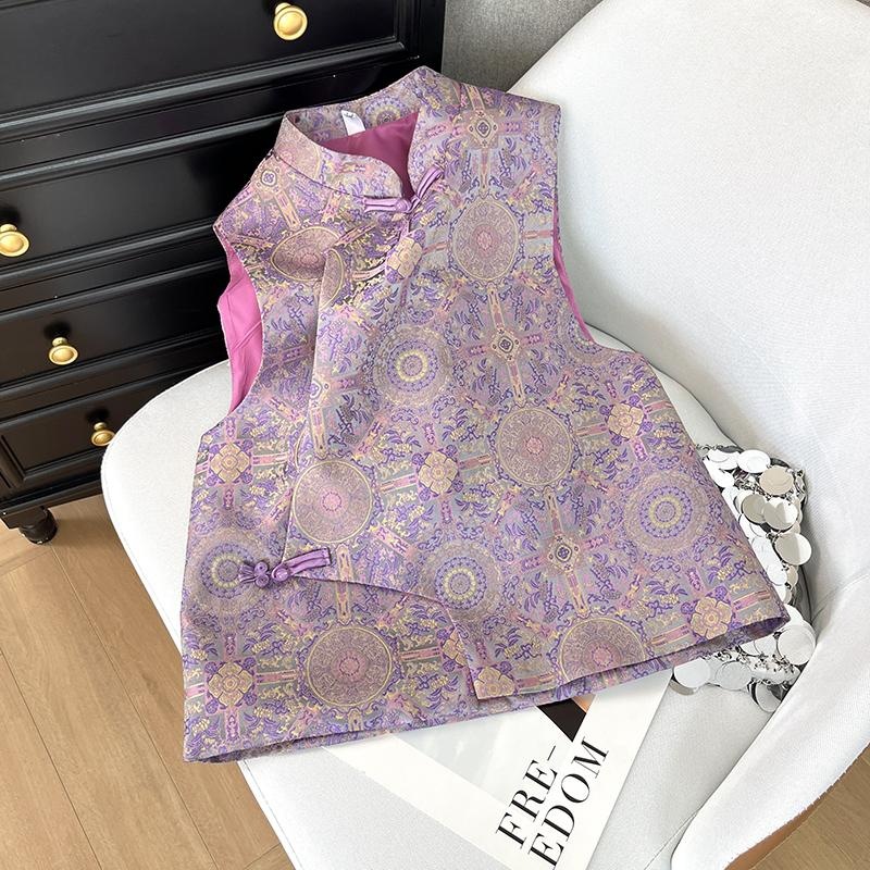 复古优雅新中式国风改良立领织锦缎提花马甲女式紫金交织盘扣马甲