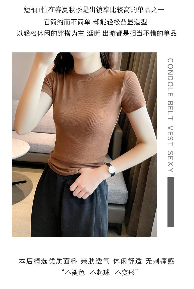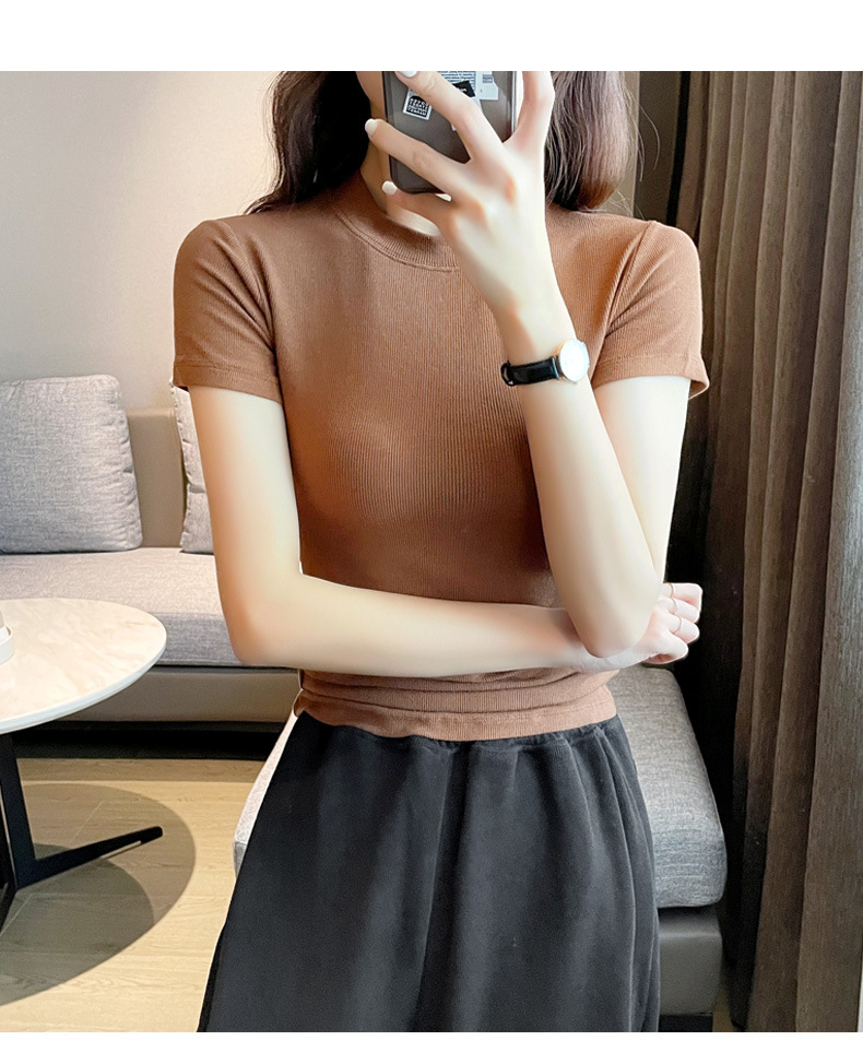 女性のための茶色の半袖 T シャツ 2025 春夏の新しいスタイルのハーフタートルネックニットボトムタイトで多用途な薄いトップ