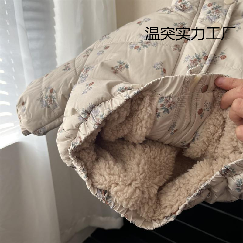 韓国の子供服の女の子の綿服の冬服のコートの新型のベルベットは保温の花の子供の高襟の綿服を厚くします。
