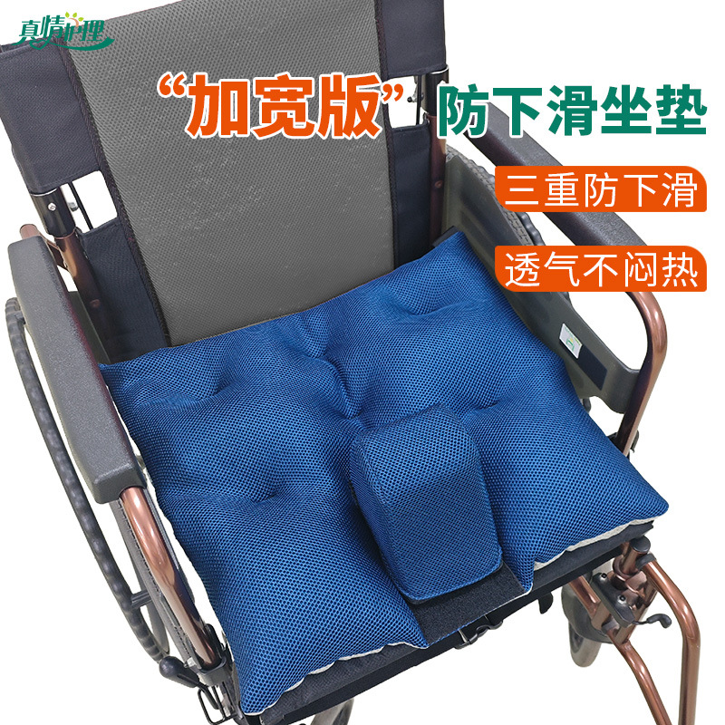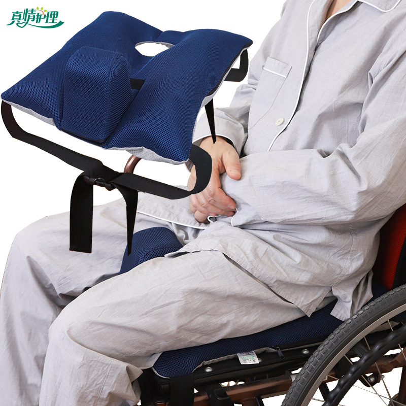 卸売り老人は車椅子の座布団を滑らないようにしています。