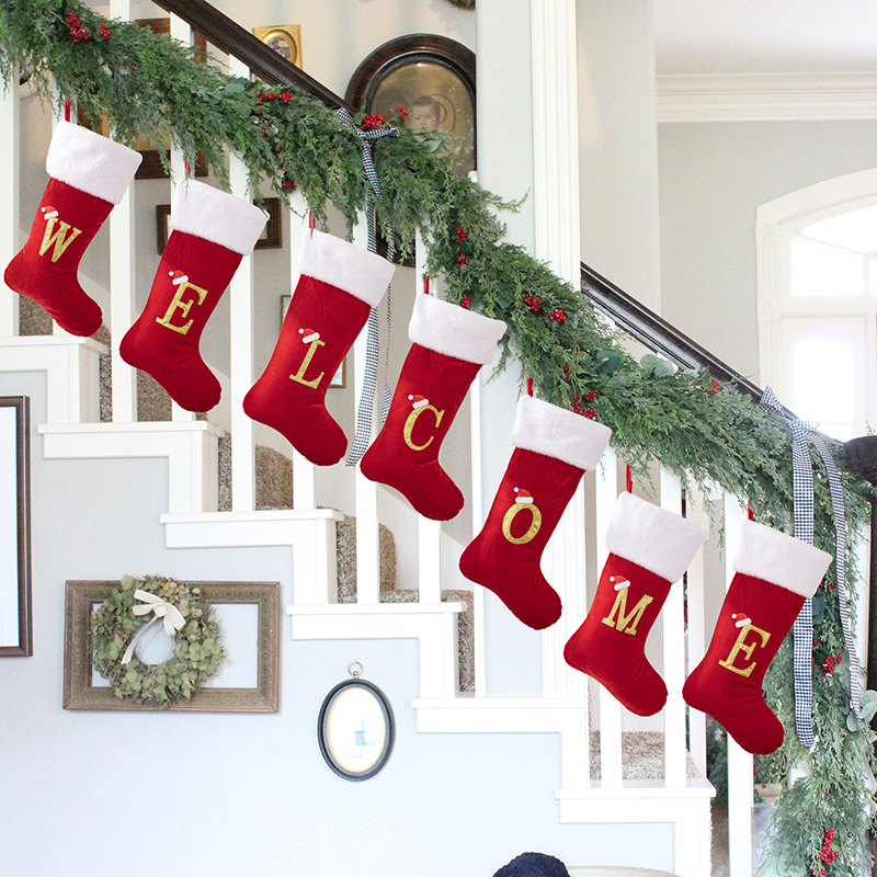 豪貝のクリスマスの装飾用品の赤い高級の金のベルベットのアルファベットの靴下のDIYの名前のクリスマスの靴下のMomのプレゼントの靴下