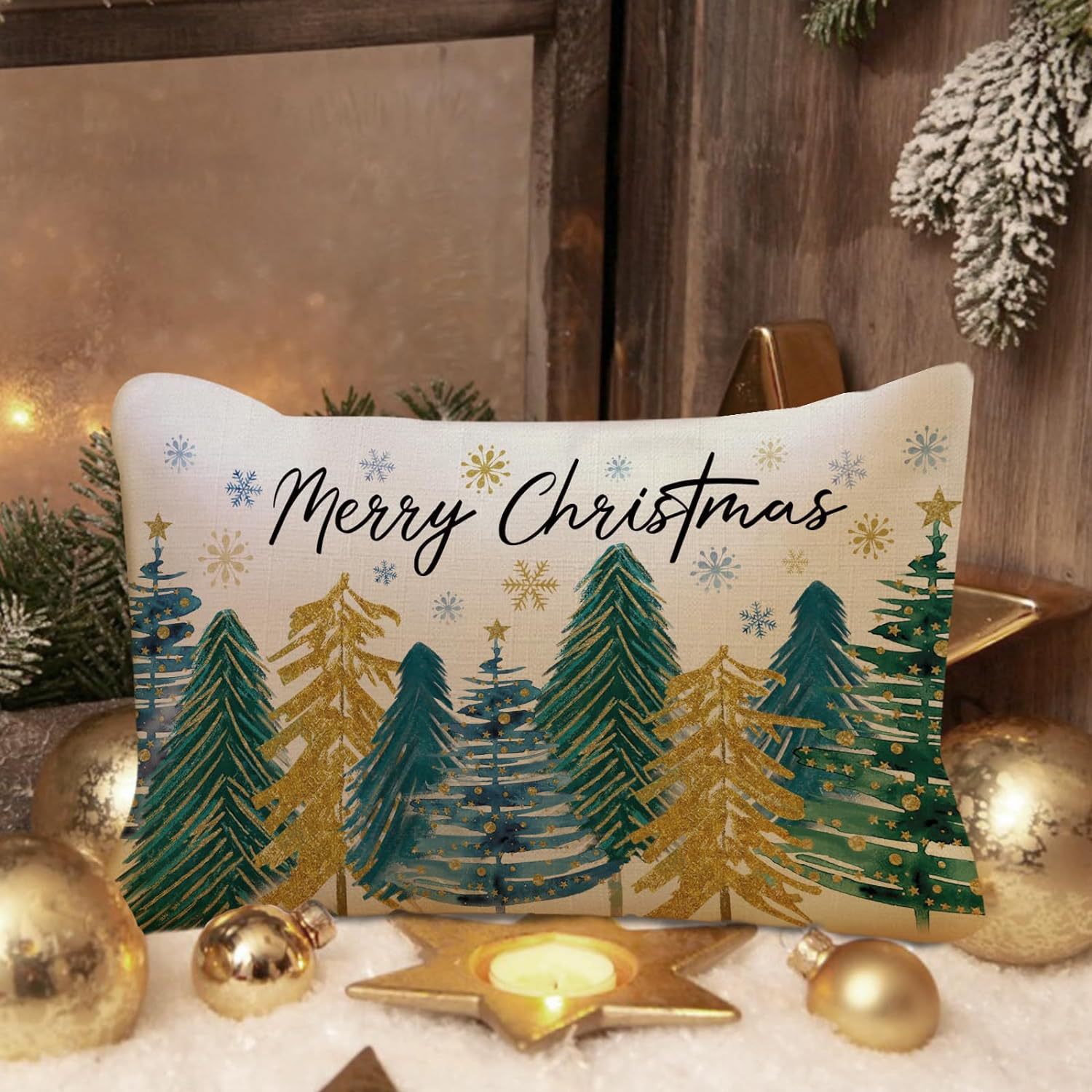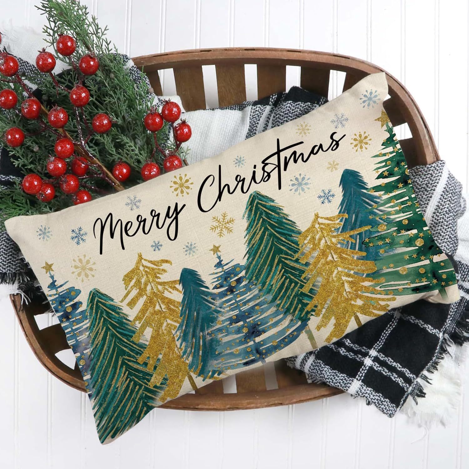クリスマスツリーと雪だるまのクリスマス柄プリント枕カバー、リビングソファ用柄入りクッションカバー、腰枕カバー