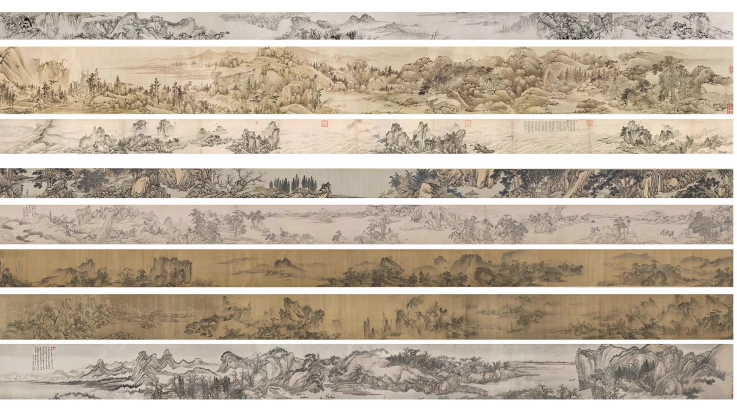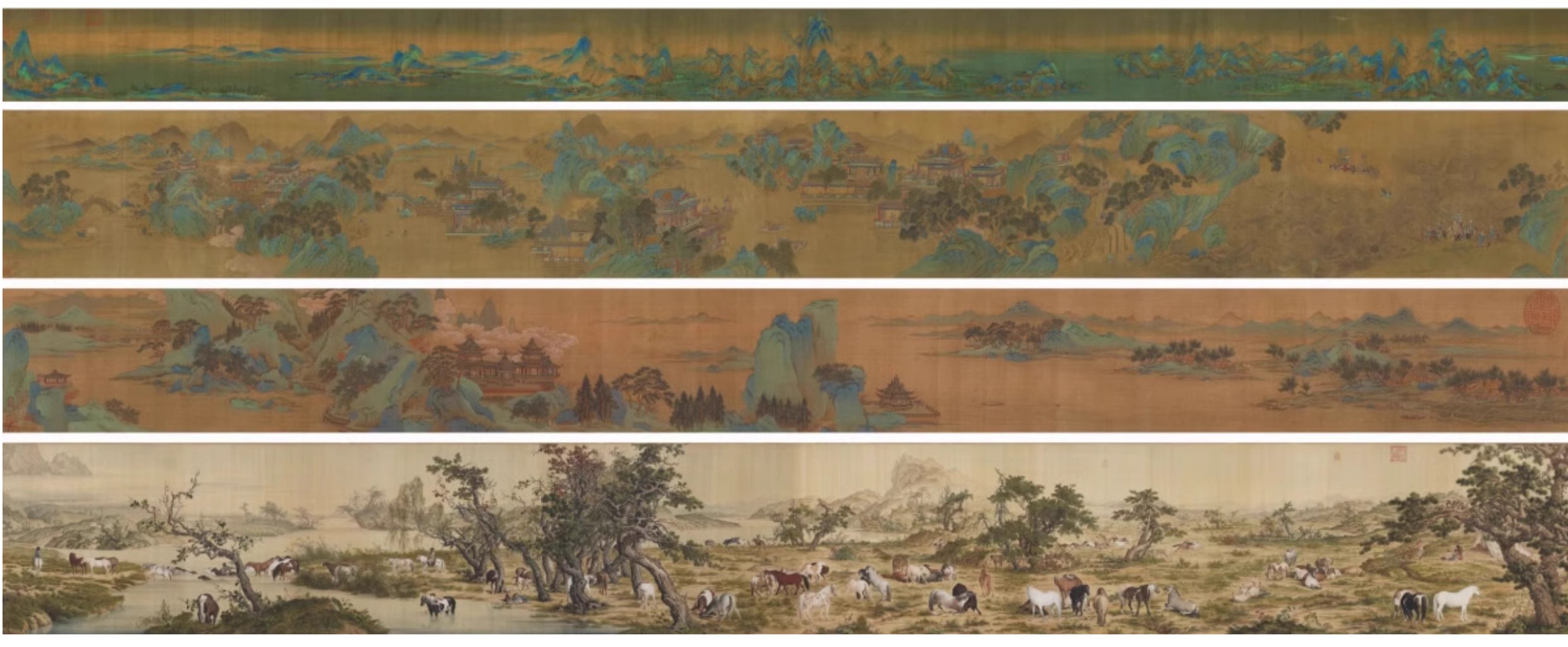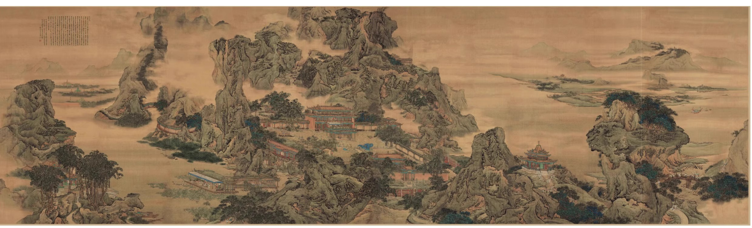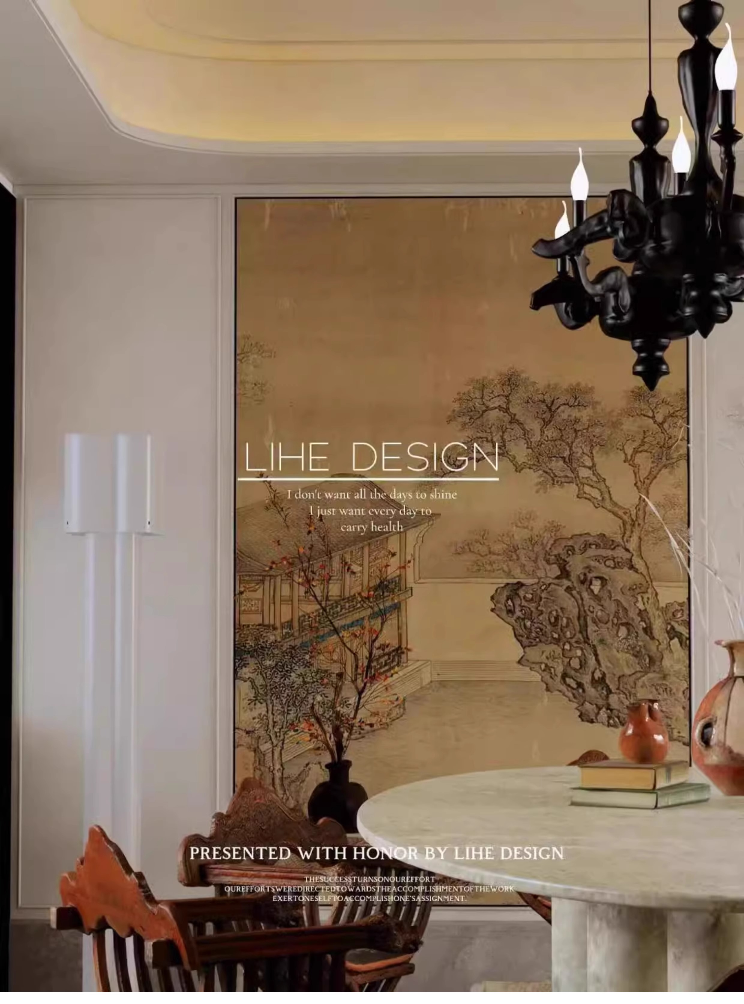 新しい中国古典名画壁紙、休園図、富春山荘図、腰線壁紙、宋風美学、中世風壁装材