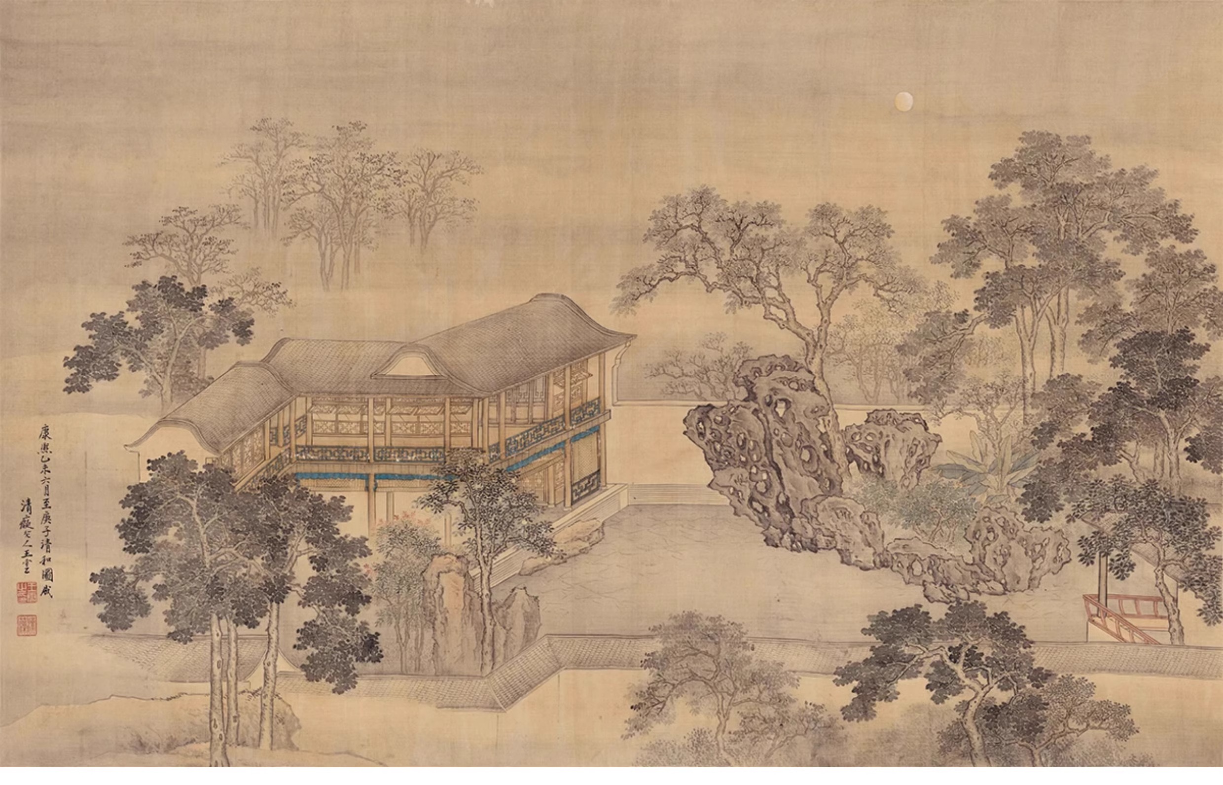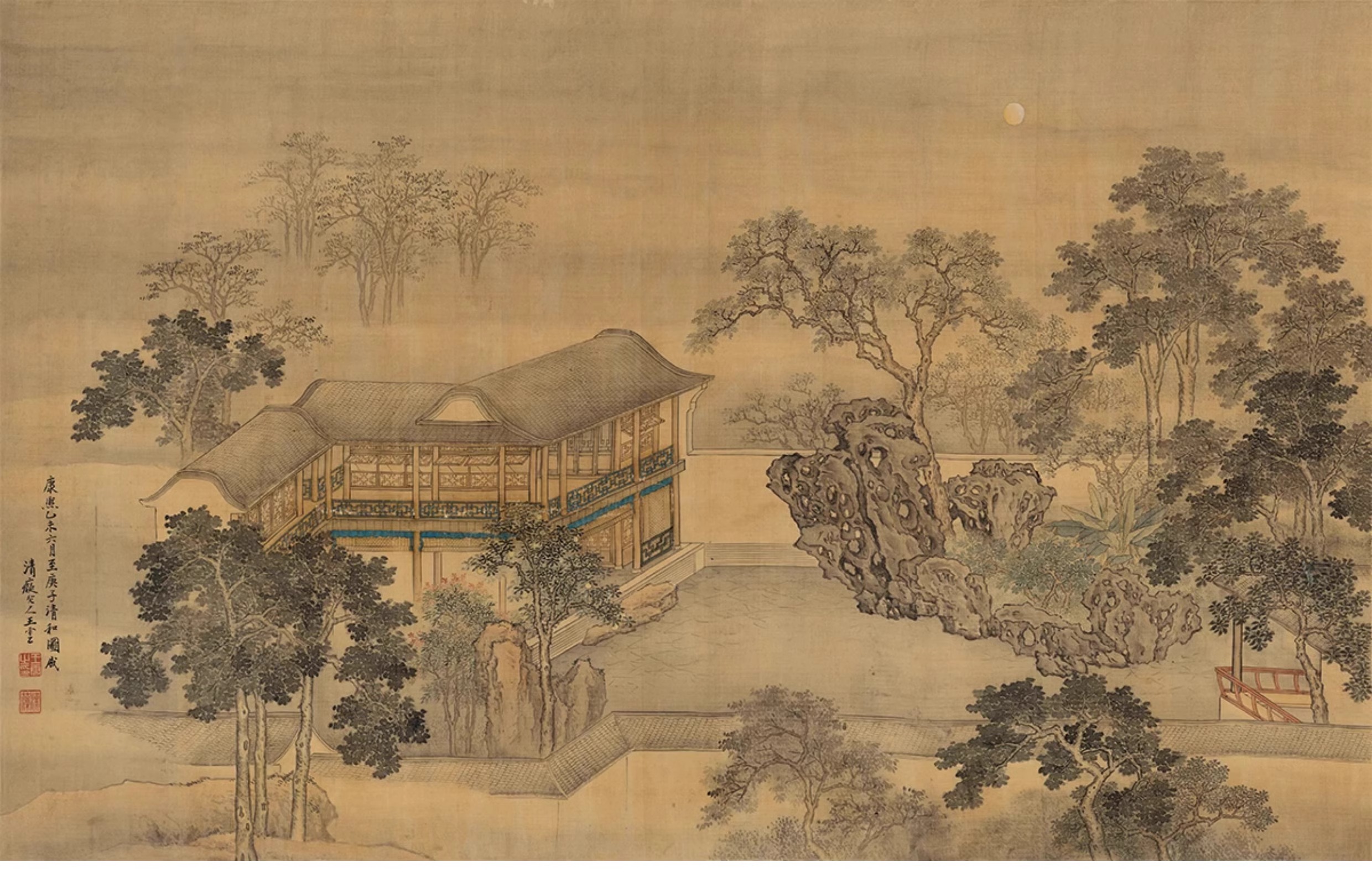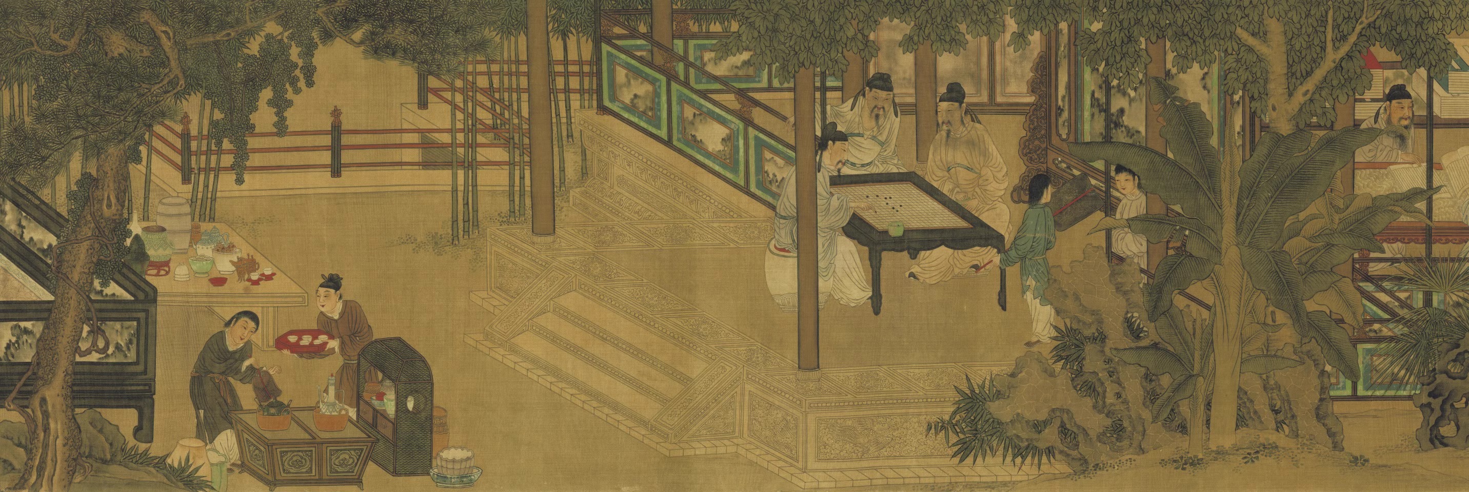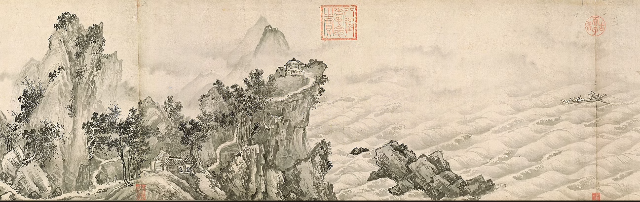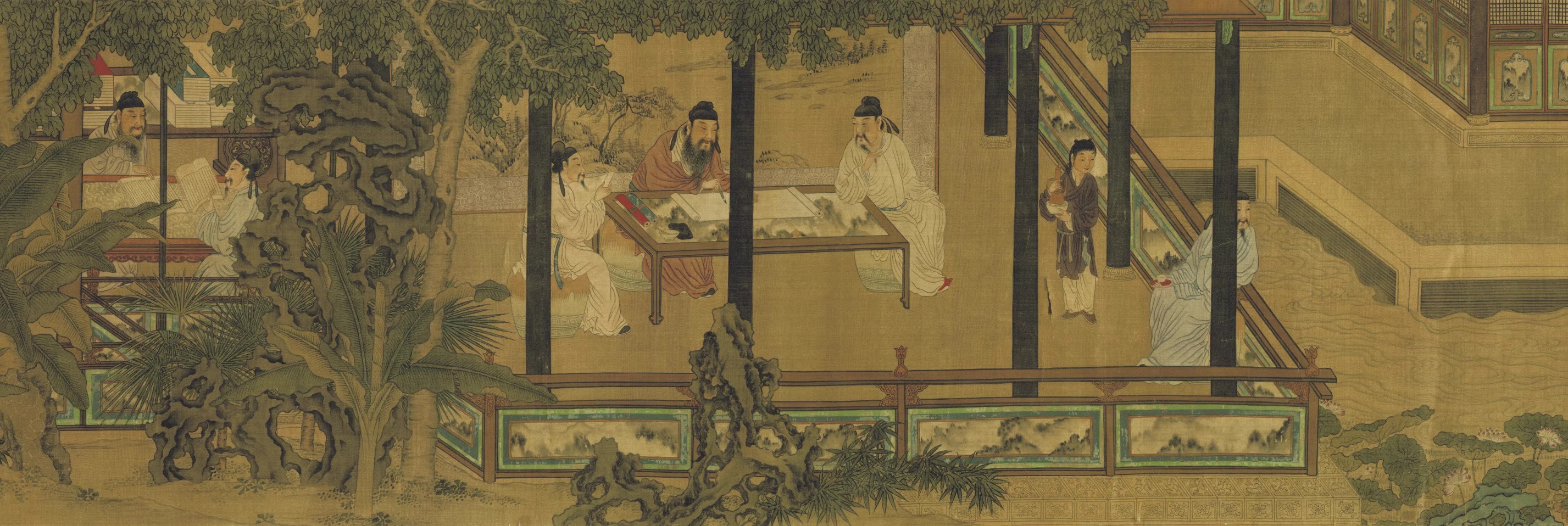 新しい中国古典名画壁紙、休園図、富春山荘図、腰線壁紙、宋風美学、中世風壁装材