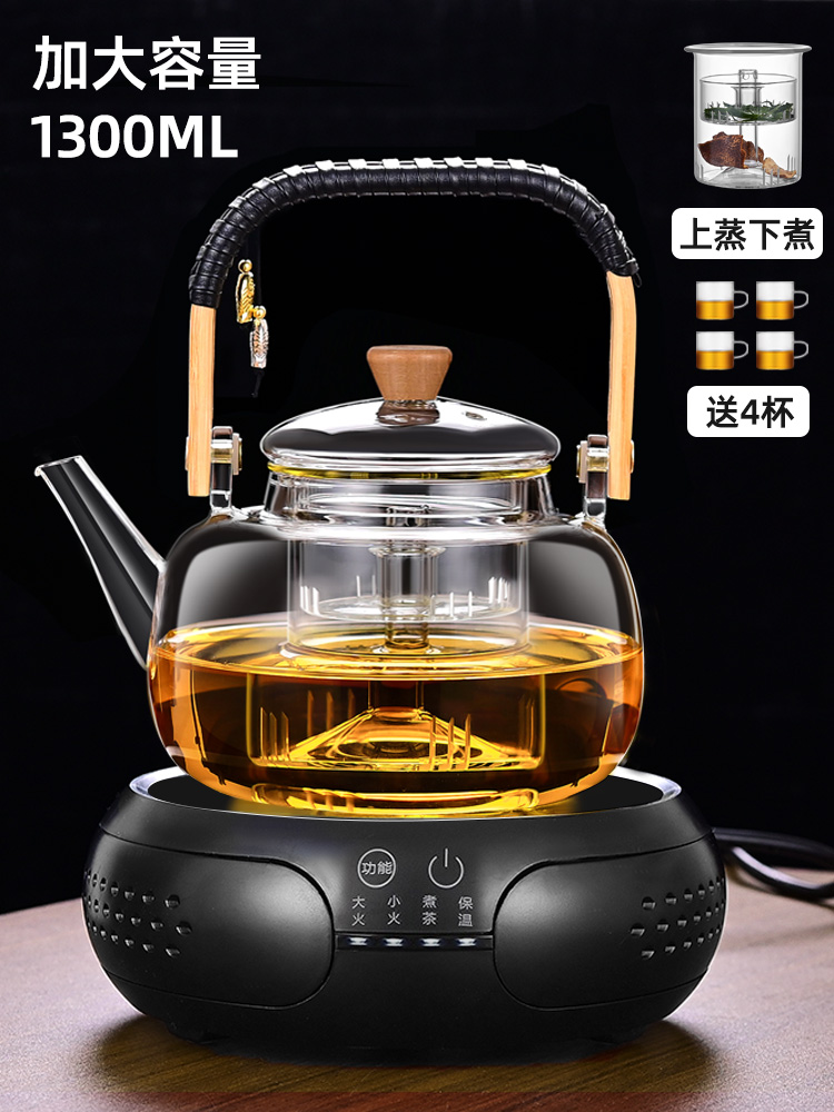 蒸しと煮込み一体型ガラスティーポット 1.3L 大容量電気セラミックストーブ加熱全自動ティーメーカー、水を沸かしてお茶を作るための特別な
