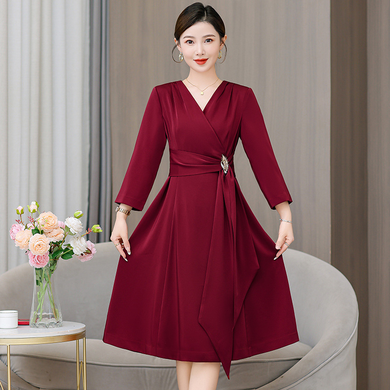 yqwl6932喜婆婆敬酒礼服2025秋季红色V领收腰系带优雅气质连衣裙