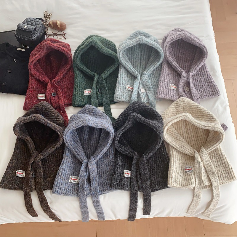 25年秋冬新作バラクラバ帽子、ボタン付きネックウォーマー一体型ニット帽、ぽっちゃり体型向け大きめサイズ、韓国風