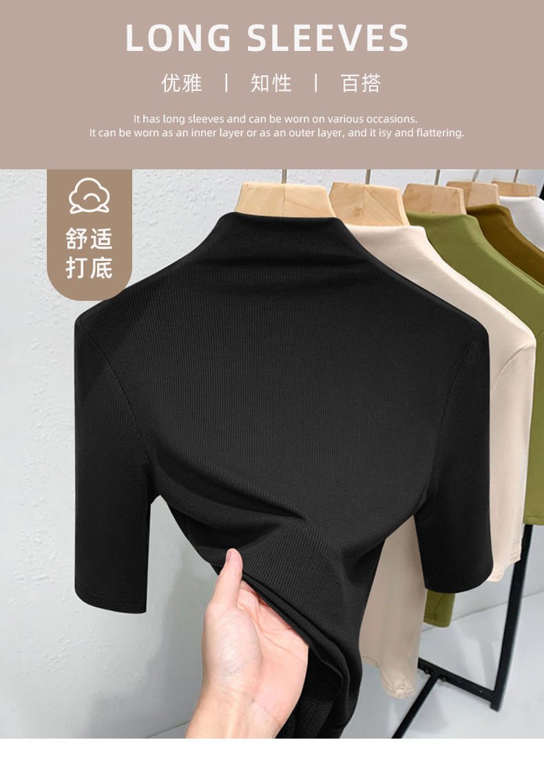 女性用ハーフタートルネックミッドスリーブTシャツ、2025年春夏新作ブラックスレッドスタイルタイトニットボトムストップ