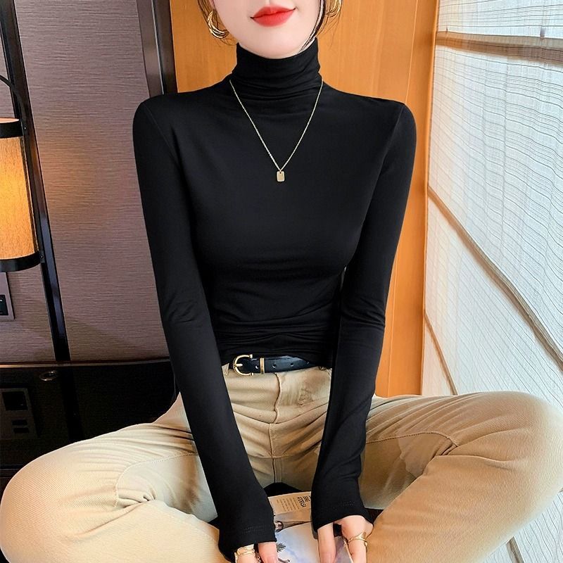 女性用モーダルブラックタートルネックボトリングシャツ、2023年秋冬新スタイルスタックカラーハイエンド長袖トップ