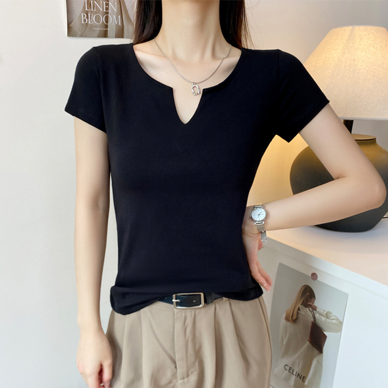 黒の小さいvネックの半袖のtシャツの女性の夏の低い襟の修身の底のシャツの百合の桃の心の襟はやせている純色の上着の潮を現します。