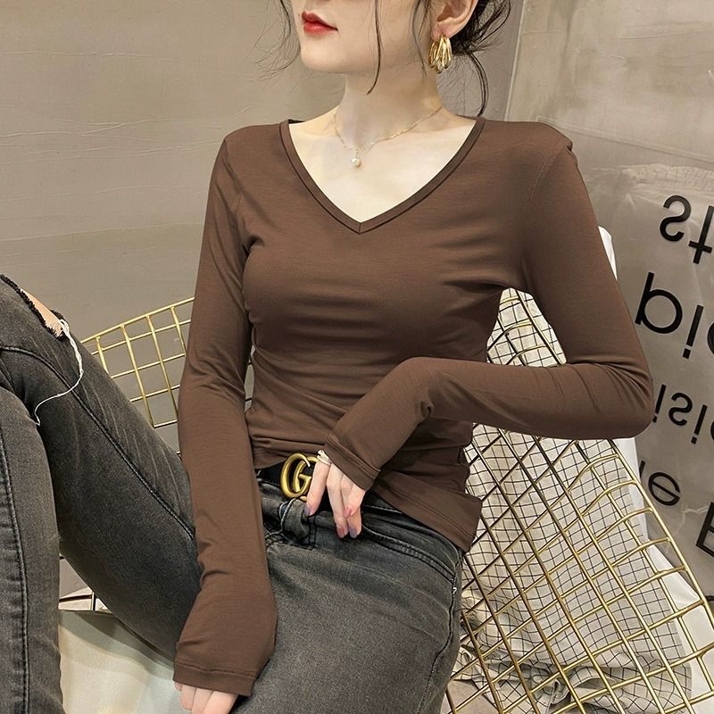 2023 新ブラウン V ネック長袖 Tシャツ女性のためのスリムフィット、スタイリッシュで多用途のモーダルボトムシャツ女性のトップ