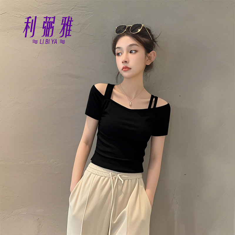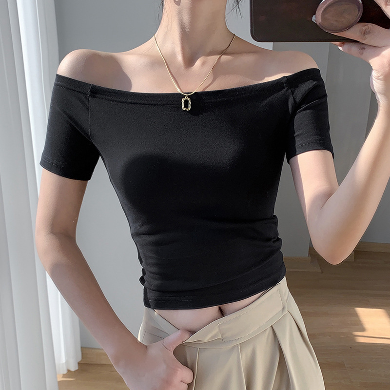 夏の新しい黒の半袖ワンラインカラーニッチデザインピュアオフショルダースリムフィットへそ露出ショートトップ女性用
