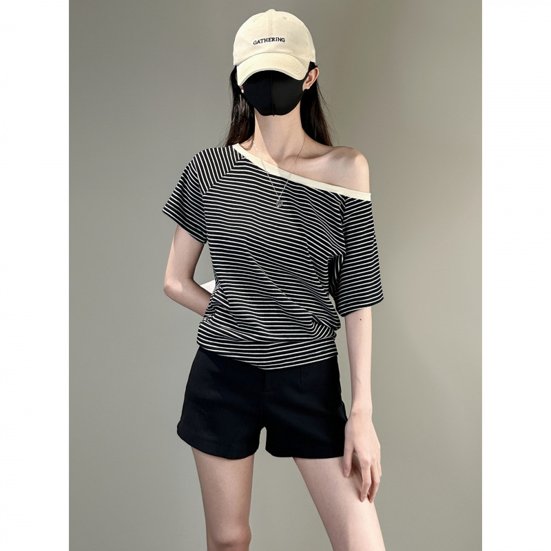 夏の黒と白のストライプのワンラインカラーの女性用ルーズ半袖Tシャツ、大きいサイズ、スリムな斜め肩デザイン、ニッチなトップス