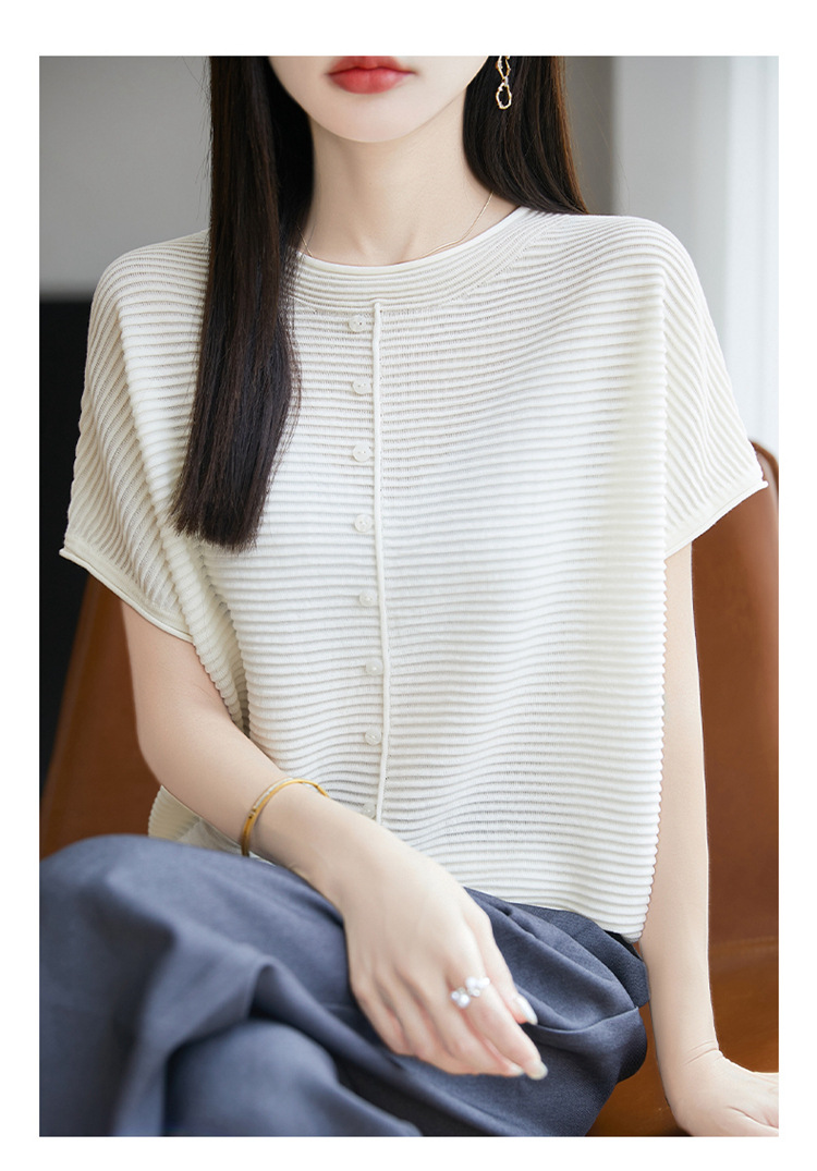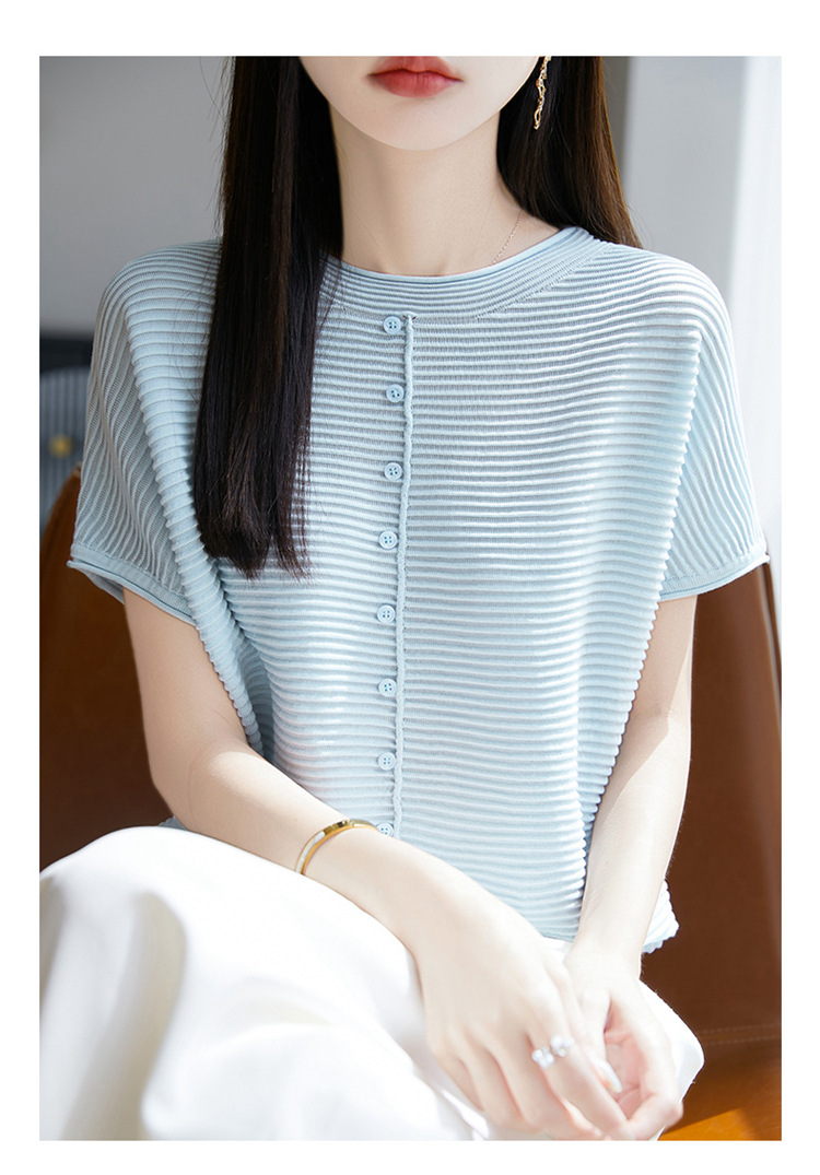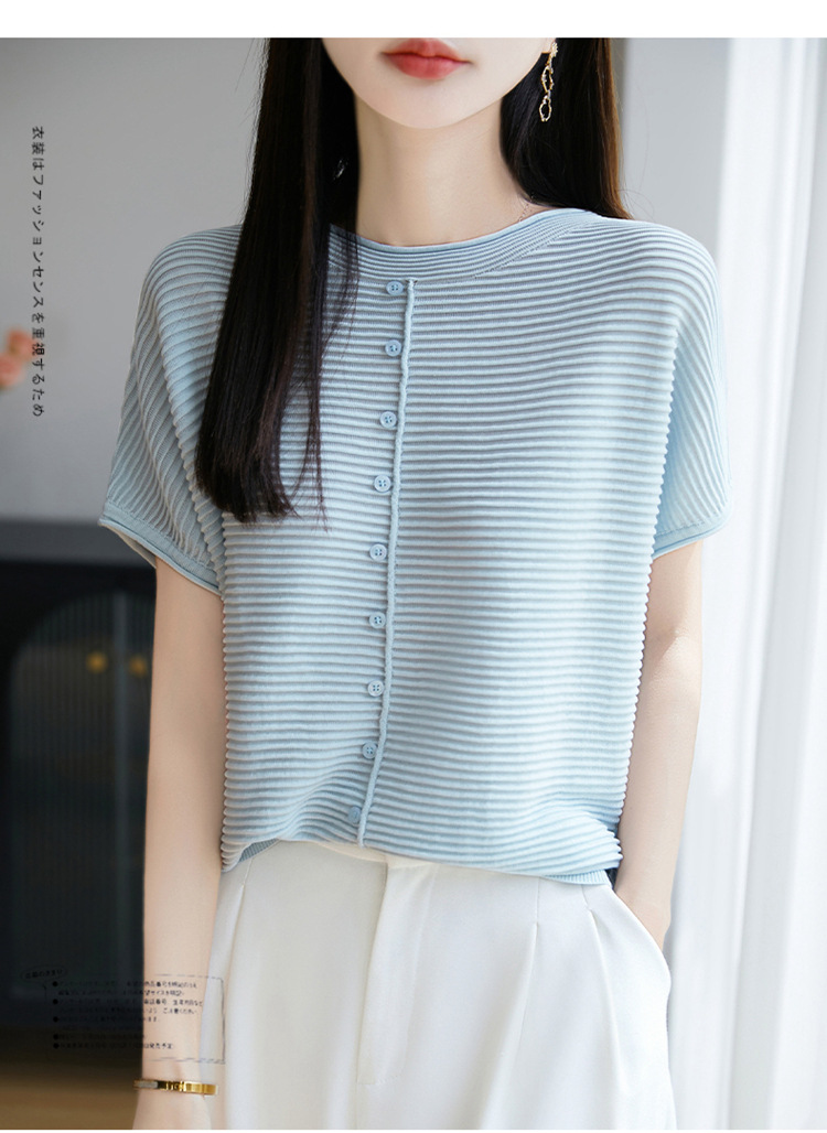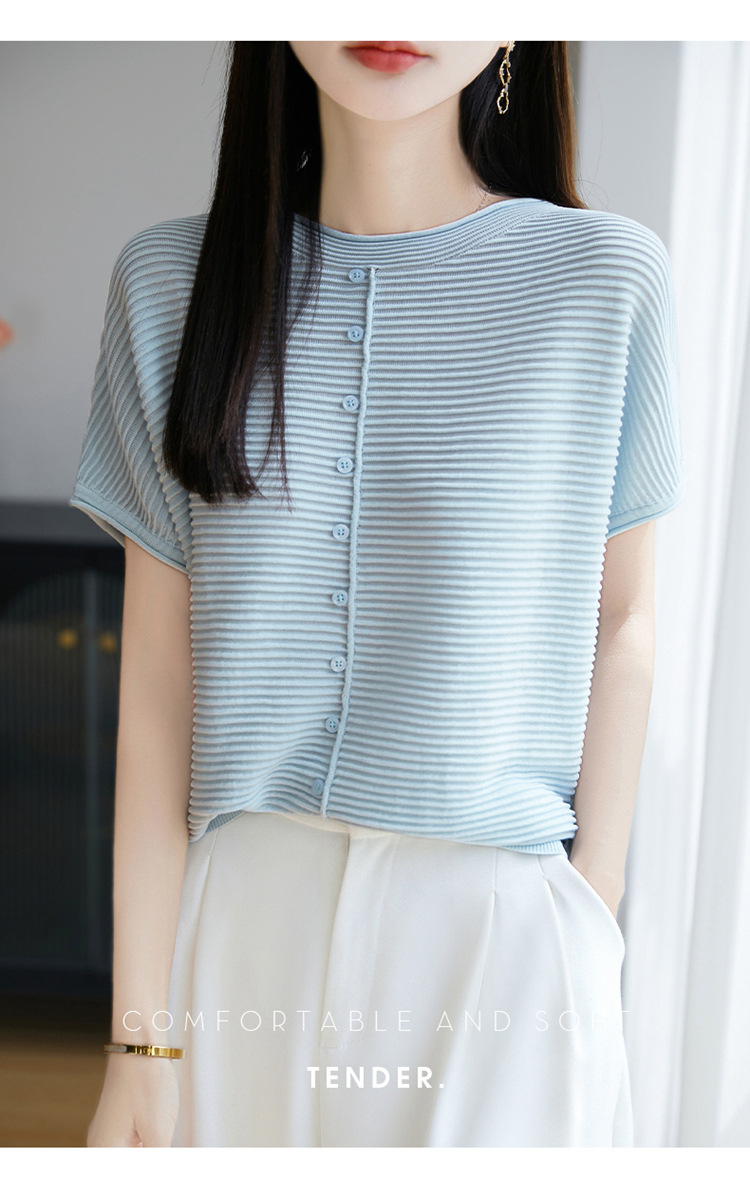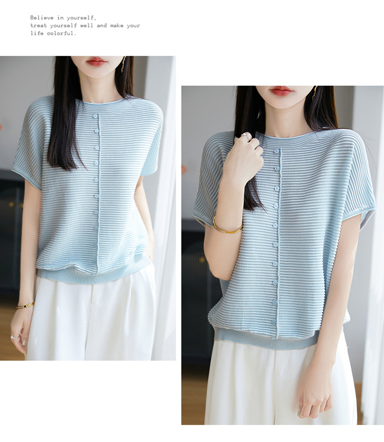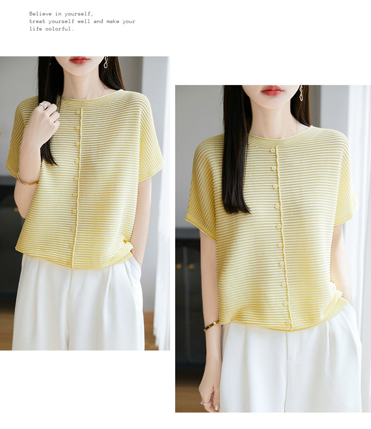 気質半袖レディース T シャツ軽量通気性ソフトストライプニットセーターフライングスリーブリヨセルテンセルラウンドネックトップ