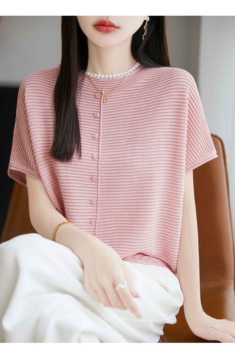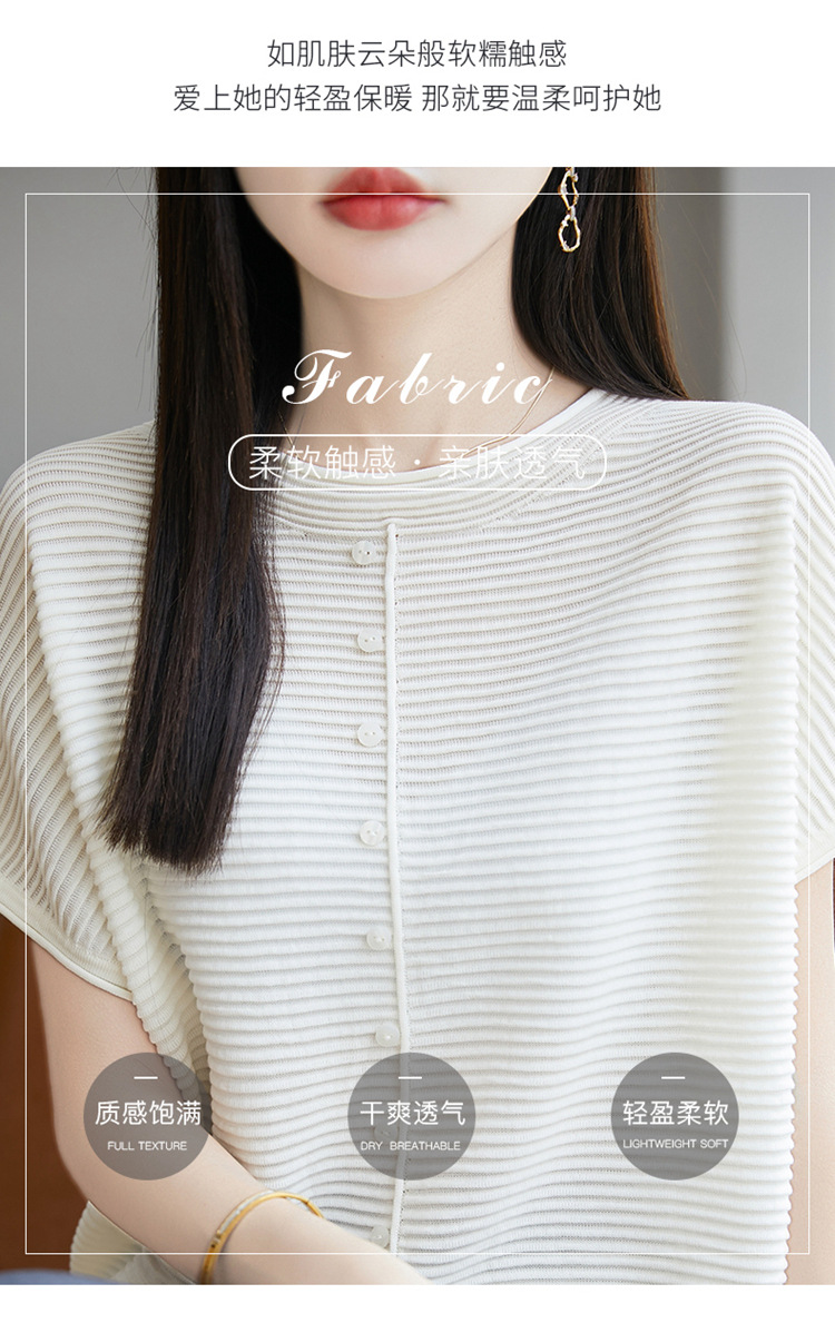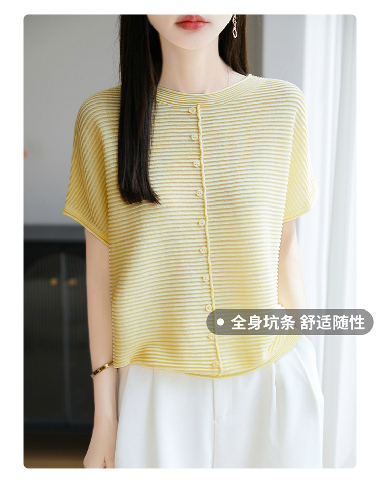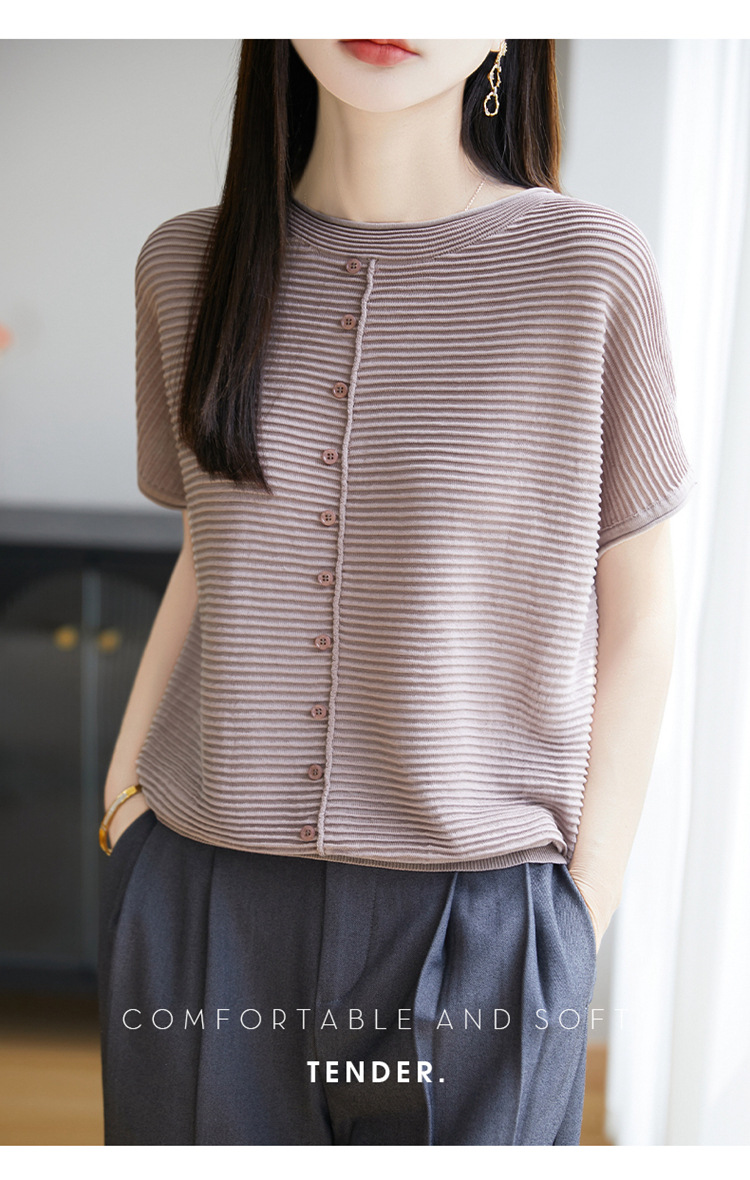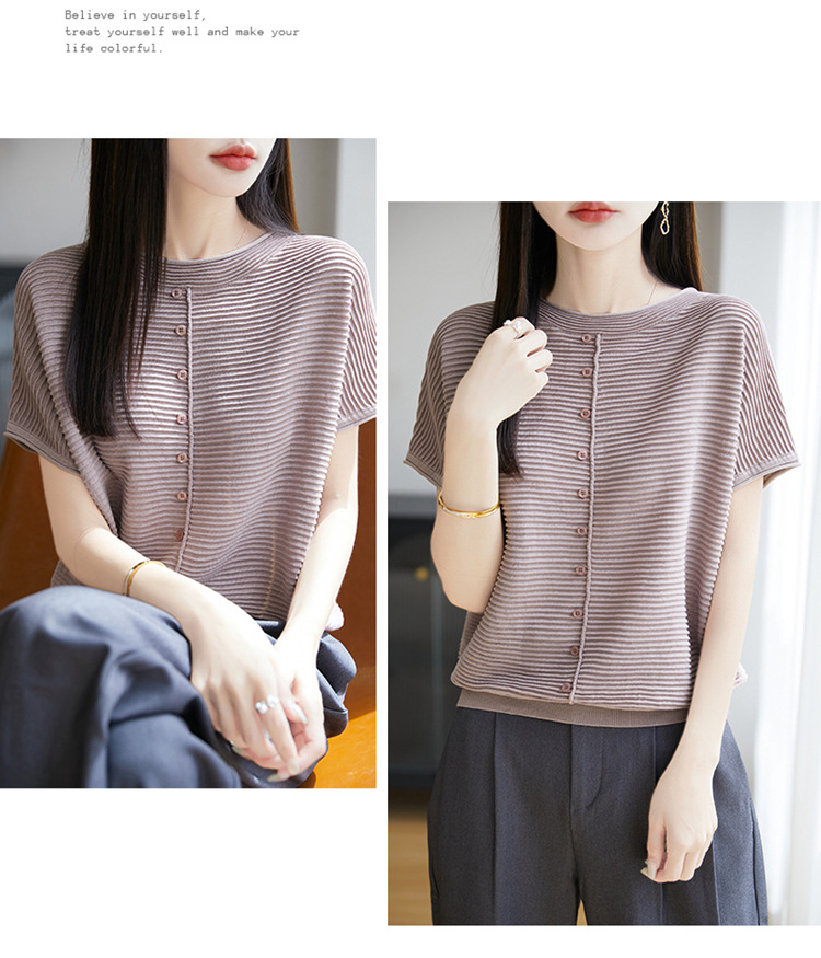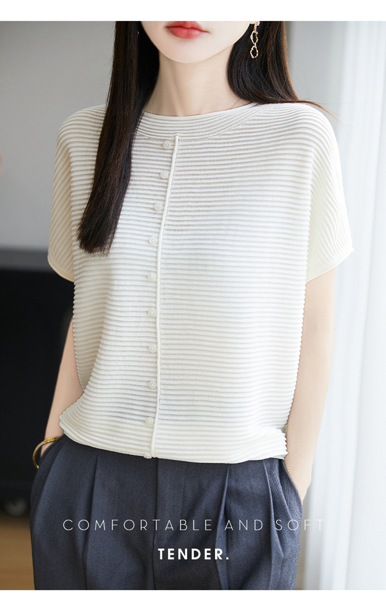 気質半袖レディース T シャツ軽量通気性ソフトストライプニットセーターフライングスリーブリヨセルテンセルラウンドネックトップ