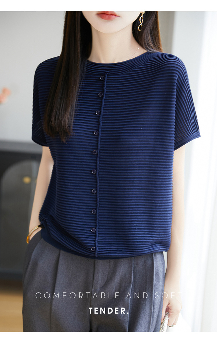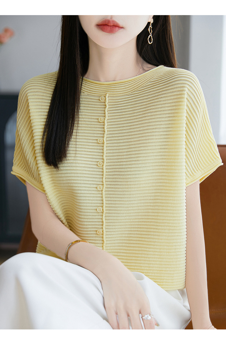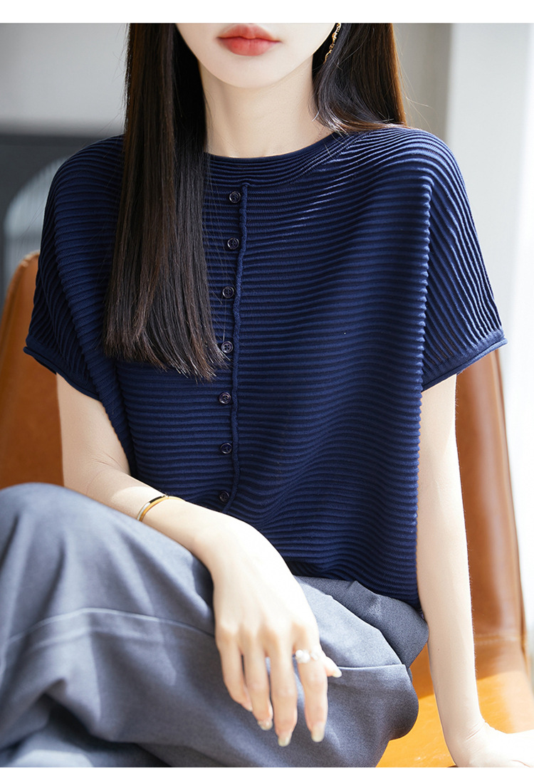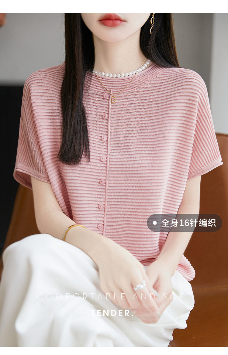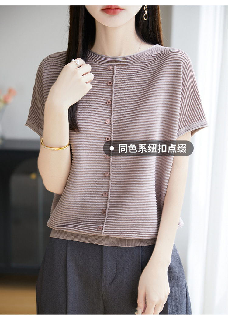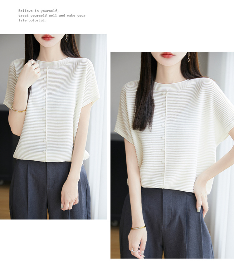 気質半袖レディース T シャツ軽量通気性ソフトストライプニットセーターフライングスリーブリヨセルテンセルラウンドネックトップ