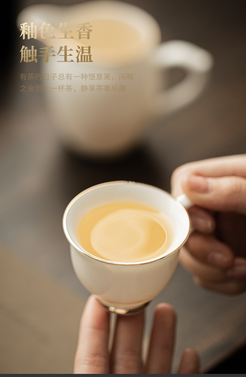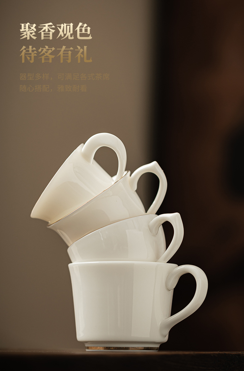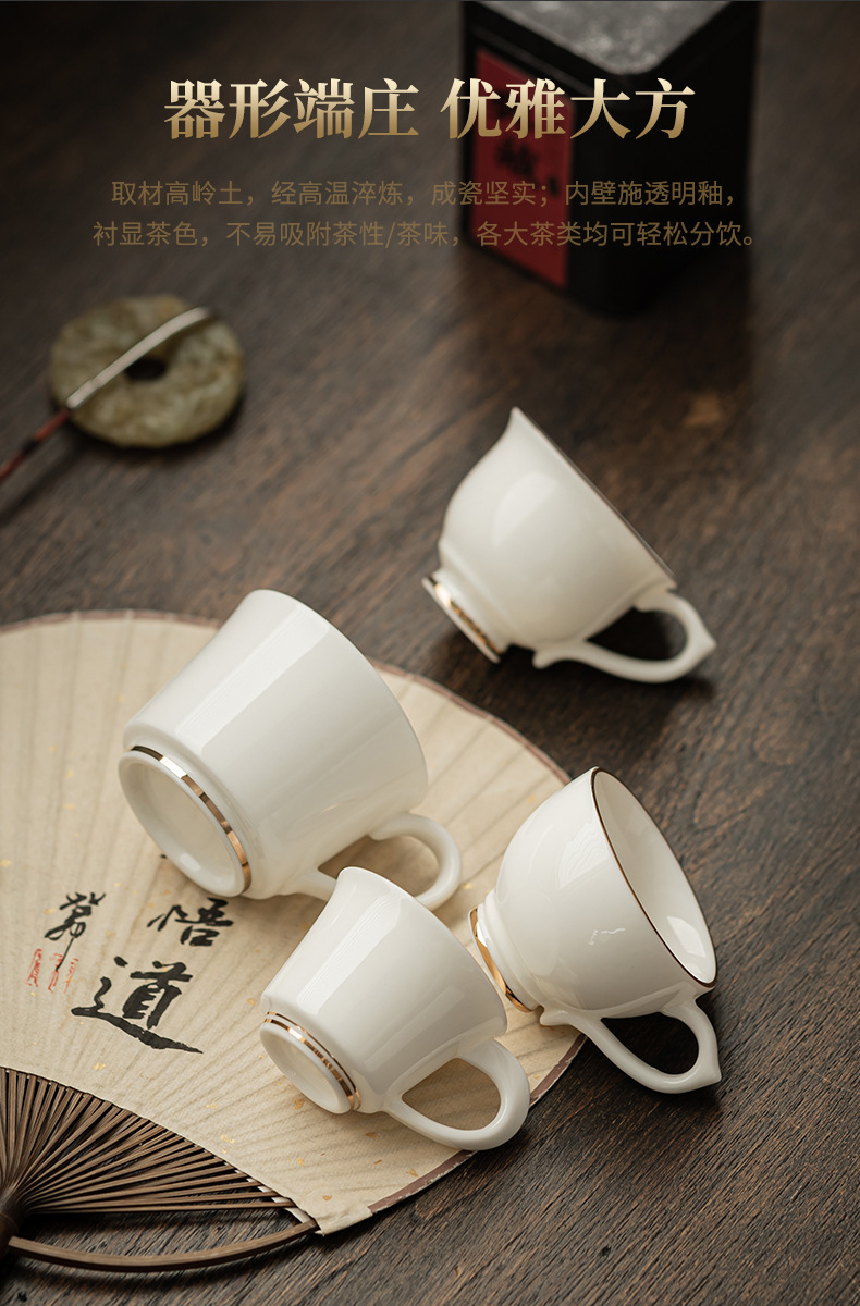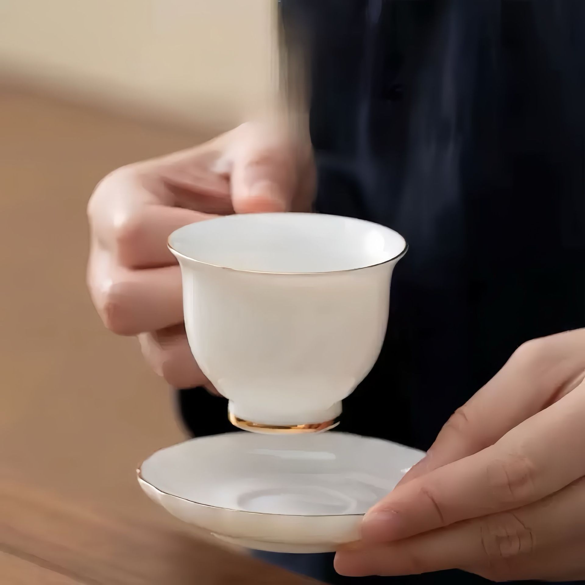 羊脂玉茶杯 白磁 カンフー茶器 茶道具 陶磁器 金縁 茶鑑 茶杯 主人杯 国潮風 茶道用