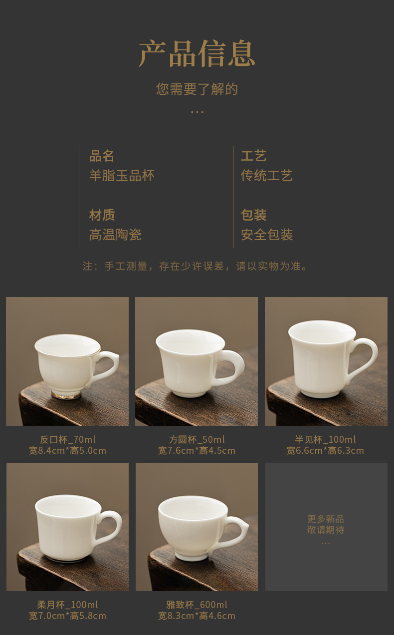 手描きティーカップ羊脂玉品茗杯主人杯陶磁器個人杯工夫茶具白磁単杯茶杯卸売り