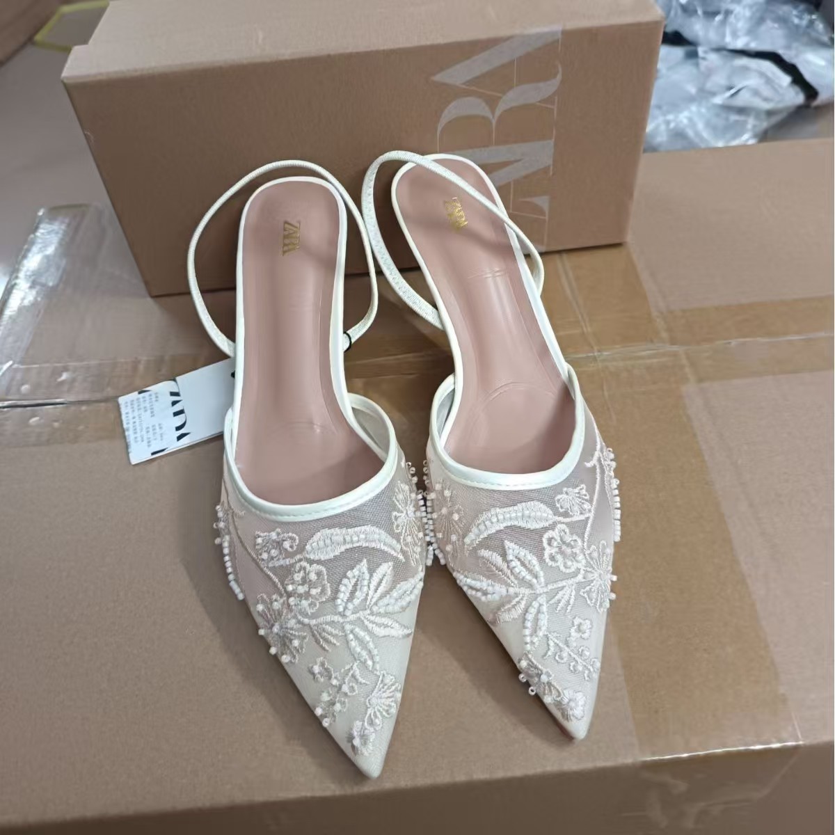 ZA2025 春夏新作白ハイヒールレディースポインテッドトゥミュールシューズスティレットヒール包頭多用途フェアリースタイルシューズ