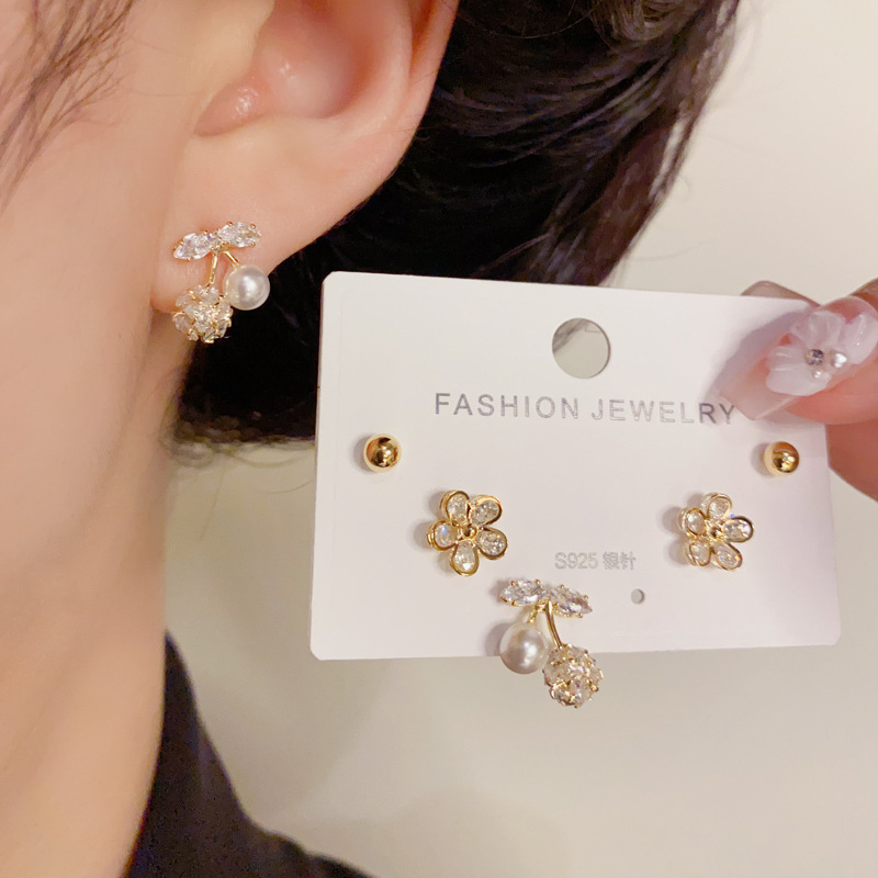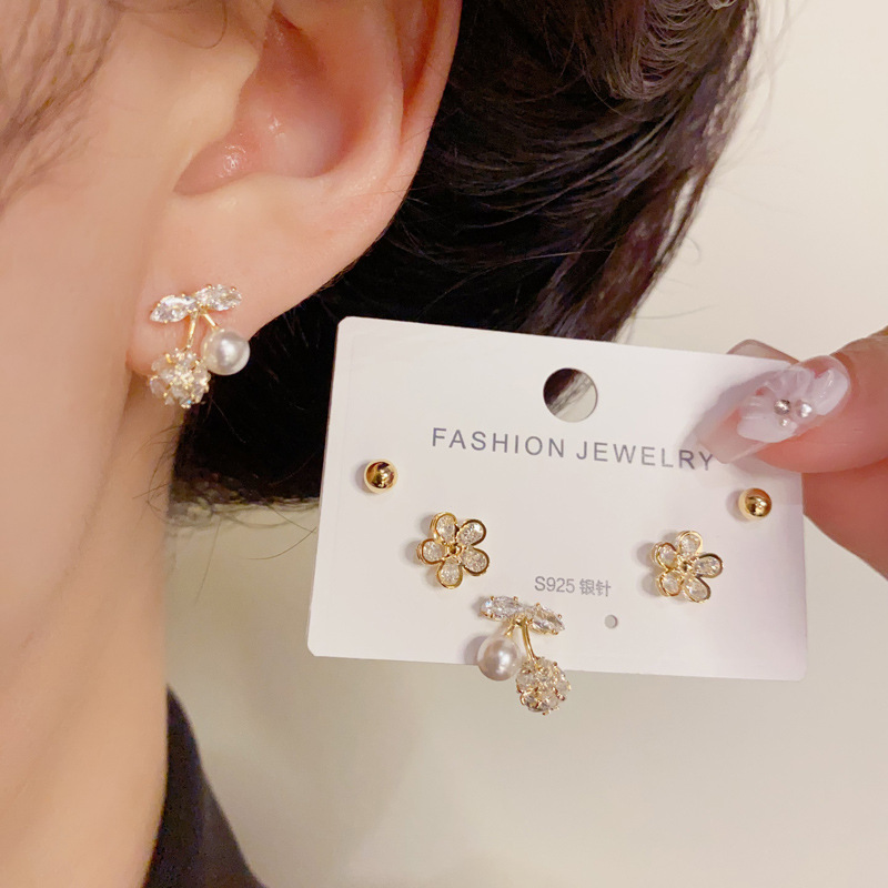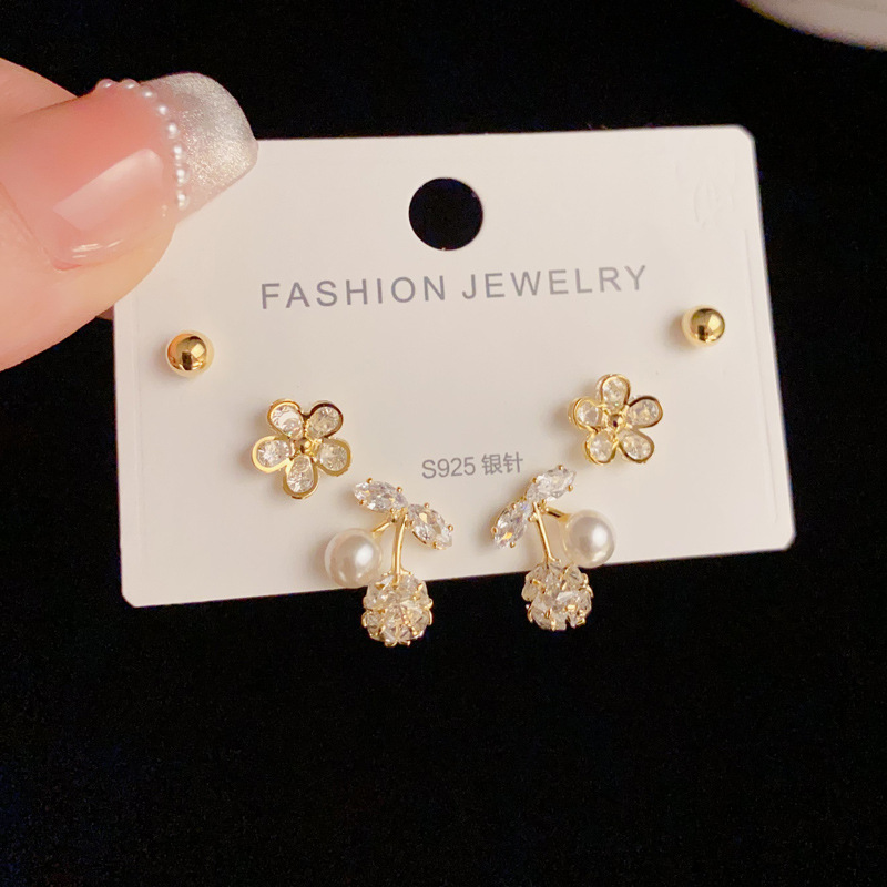 法式精致时尚百搭高级感满钻花瓣球球三件套耳钉小众气质简约耳饰