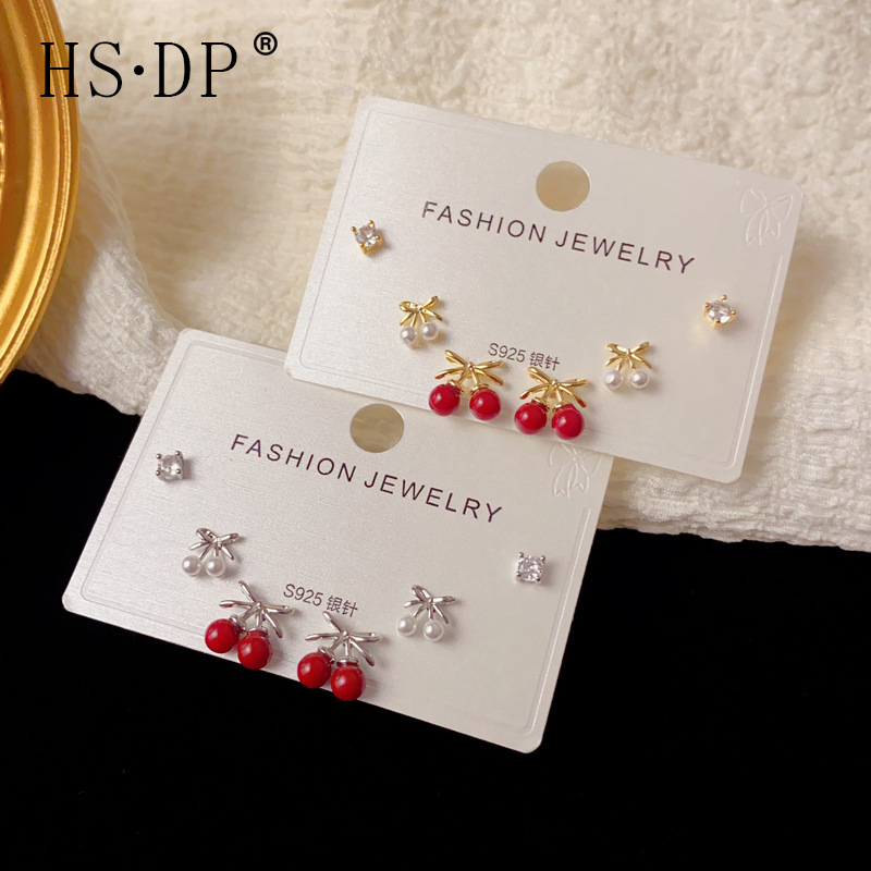 小众时尚甜美百搭红色樱桃三件套耳钉气质轻奢简约设计感耳环批发