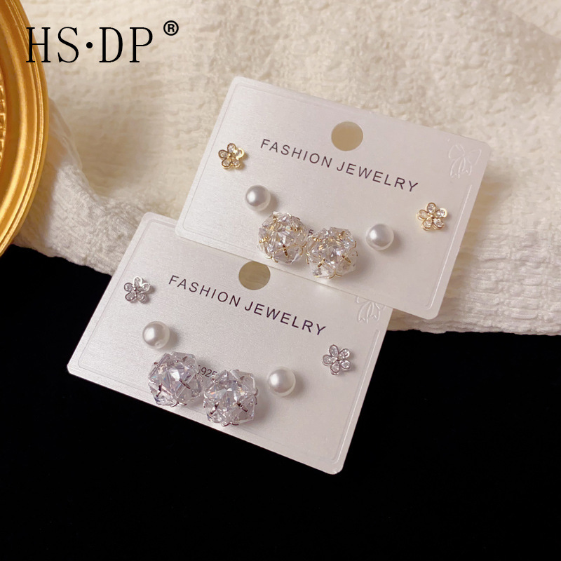 小香风微镶锆石交叉珍珠三件套耳钉精致时尚百搭通勤超闪耳环批发