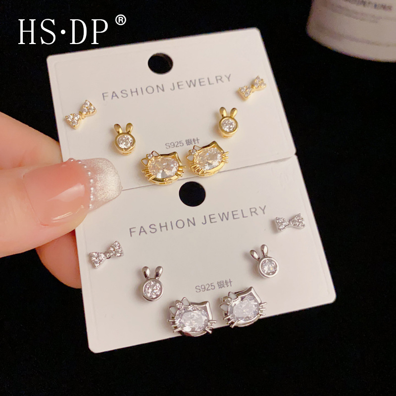 S925銀針気質ファッション満ドリルKT猫蝶ネクタイ三点セットピアス女性小型かわいいイヤリング卸売り
