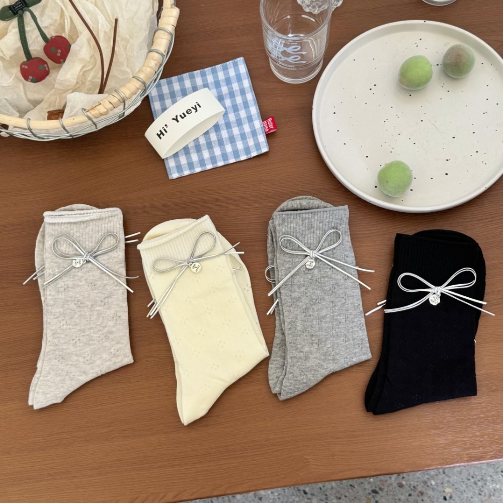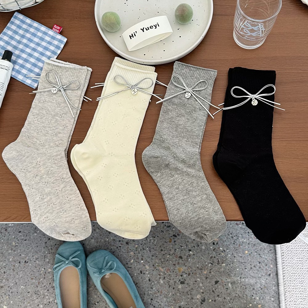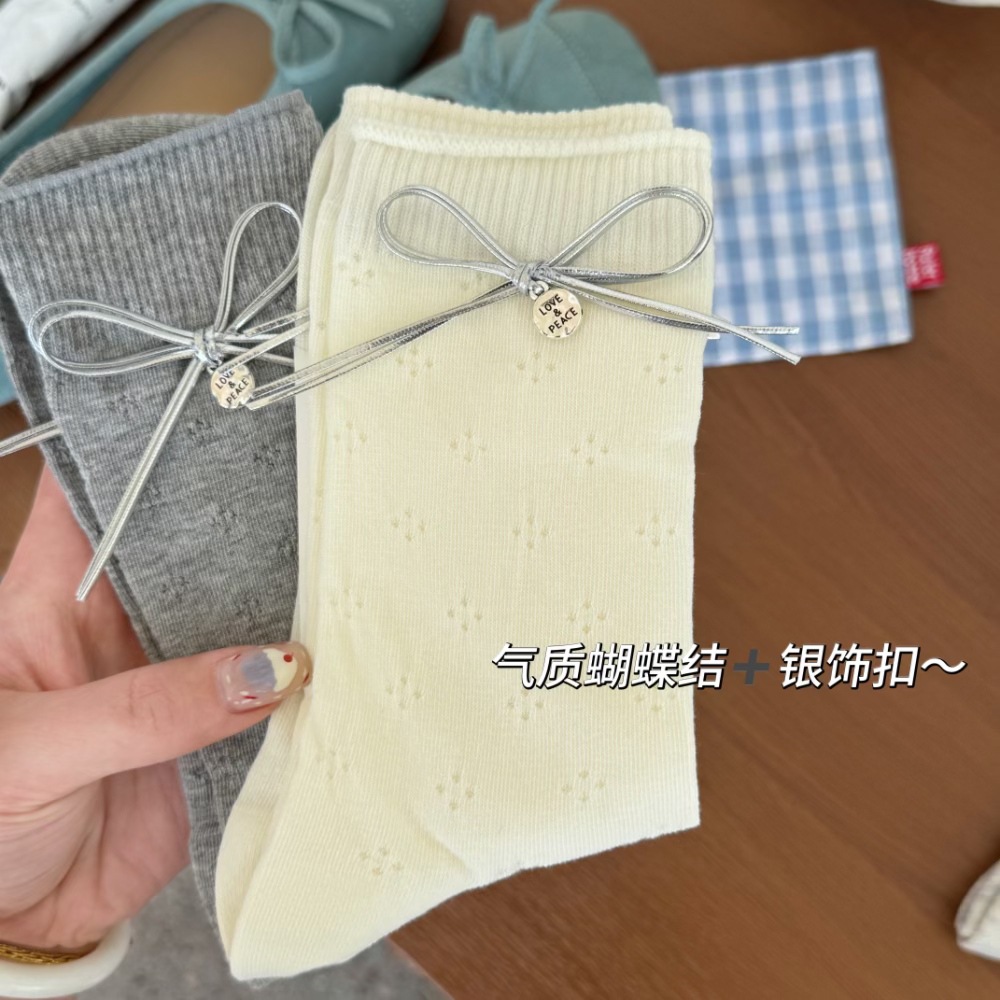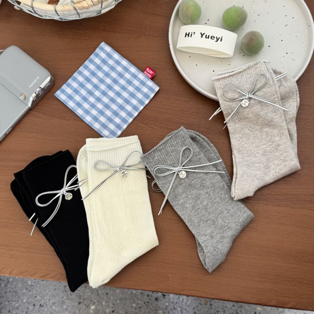 韓国の靴下の女性の純色の透かし彫りjk靴下の蝶結びinsアクセサリーの靴下のクリーム色の木の耳の縁の靴下の女性