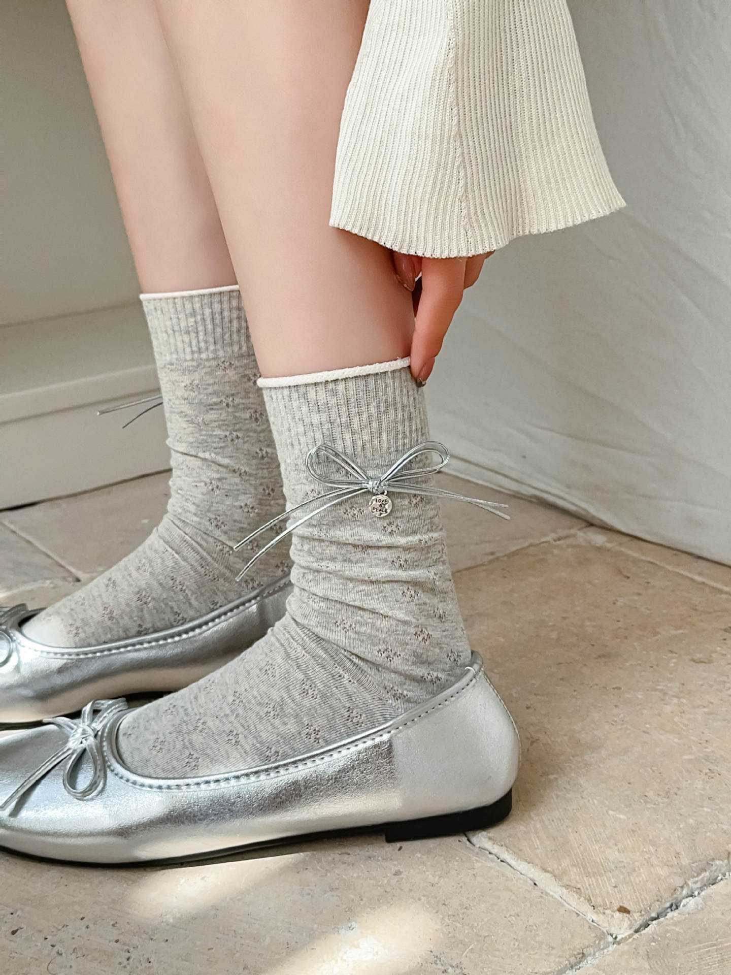 韓国の靴下の女性の春夏の薄い四つ葉の草の透かし彫りの白い靴下の皮質の銀色の蝶結びの銀の飾りのボタンの積み重ねの靴下
