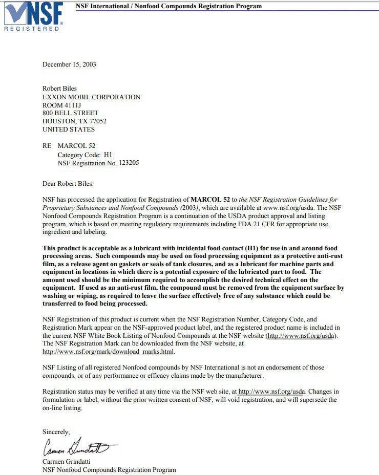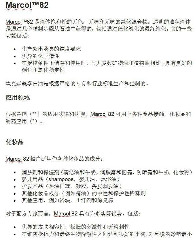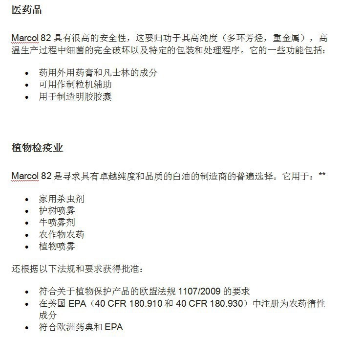 根据各国(**)的适用法律和法规,Marcol 52可用于各种食品接触,化妆品和制药应用(*)。