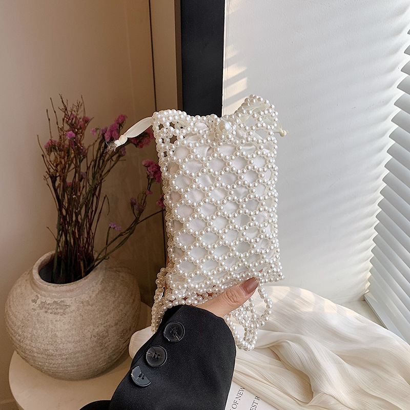 クロスボーダーパールハンドバッグ2025新しい織バッグネットレッドレトロビーズバケットバッグトレンドショルダーメッセンジャーバッグ