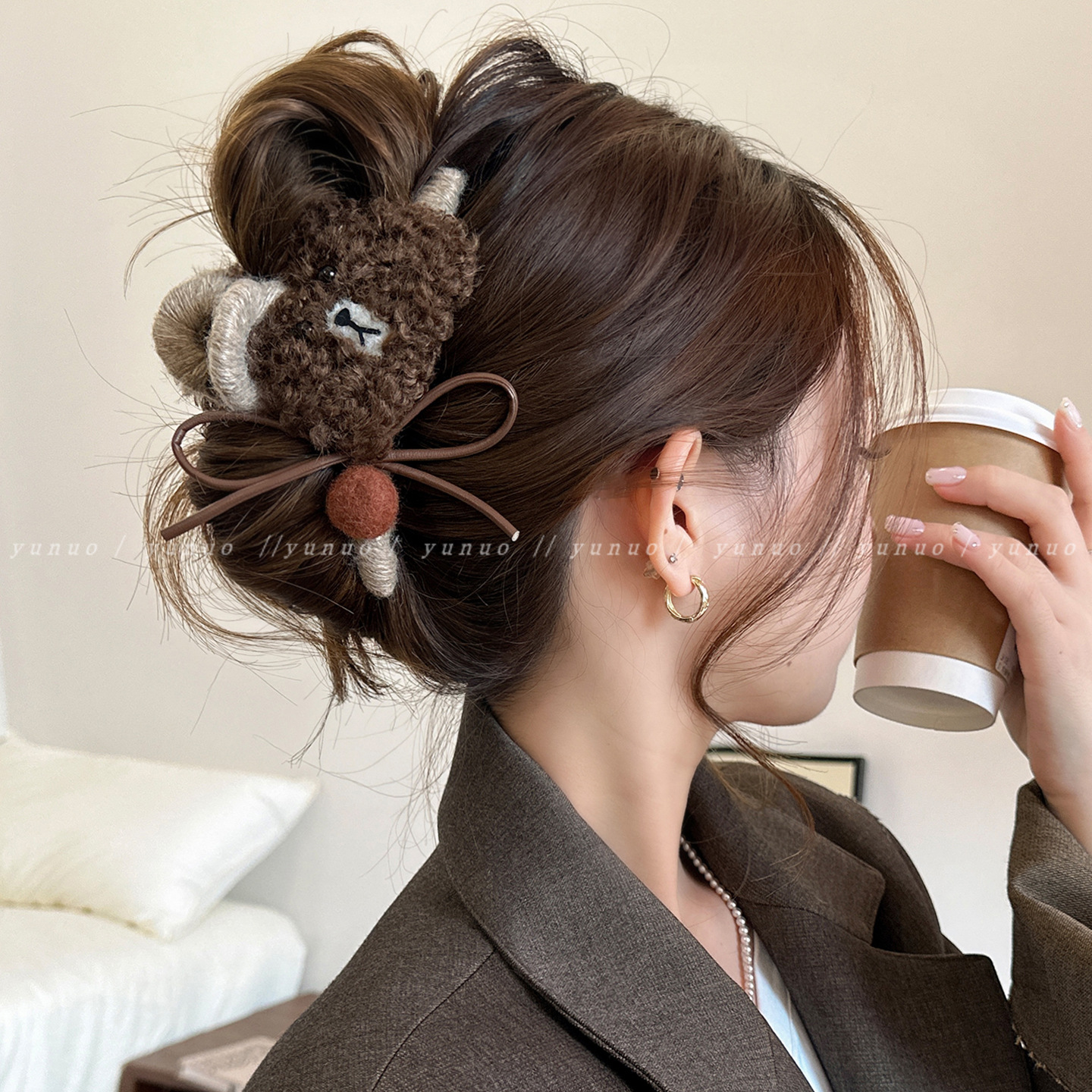 小众设计可爱毛绒小熊大号抓夹女后脑勺发夹高级感鲨鱼夹2025新款