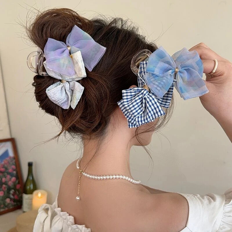 韓国系の気質のデニムの蝶結びの高い馬尾は女性の2025新型のヘアピンの後頭部の高級感のサメのクリップをつかみます。