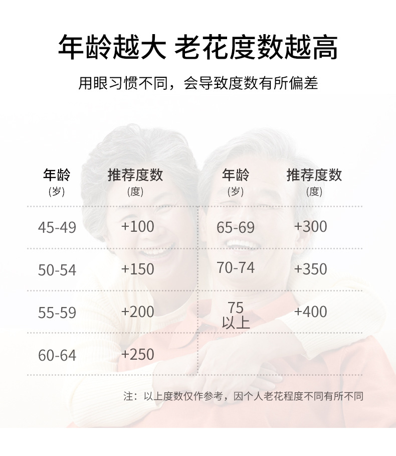 +100度【50歳以下推奨】,+150度 [50~54歳推奨],+200度 [55~59歳推奨],+250度 [60~64歳の方におすすめ],+300度 [65~69歳の方に推奨],+350 度 [70 ~ 74 歳の方に推奨],+400度 [75歳以上の方に推奨]