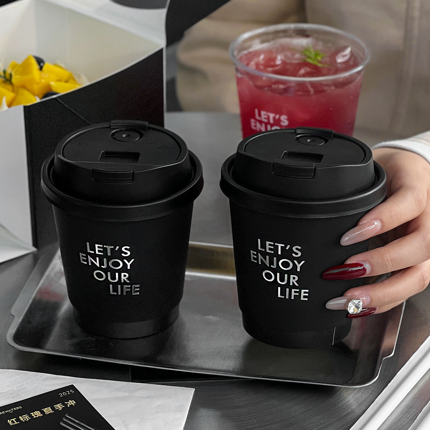 一次性咖啡杯奶茶纸杯黑色高级热饮外带打包杯子烫银带盖商用