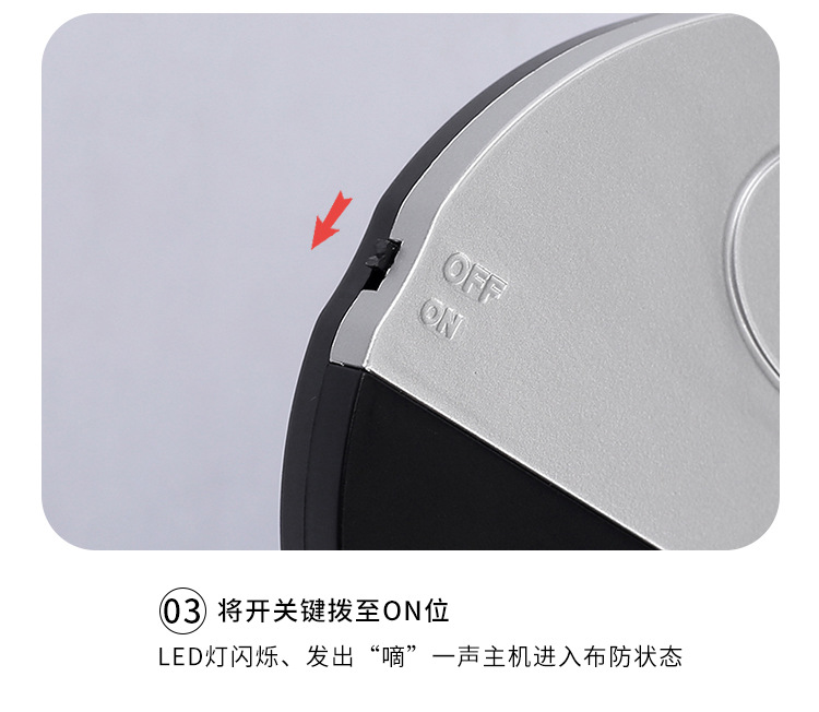 1:打开拨动开关,主机指示灯闪烁,5秒后滴一声进入工作感应状态.