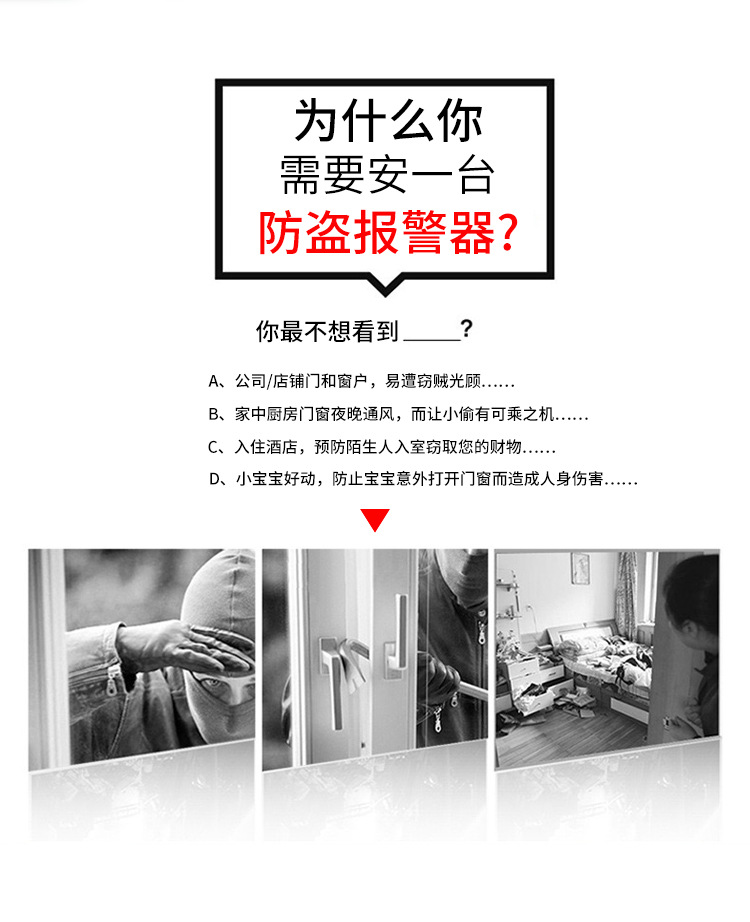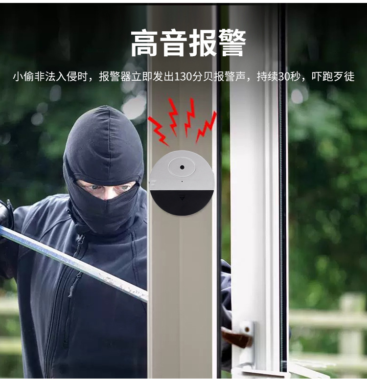 高分贝门窗报警器,适用于家居、酒店、出租屋、商铺、店面等场所防盗使用。