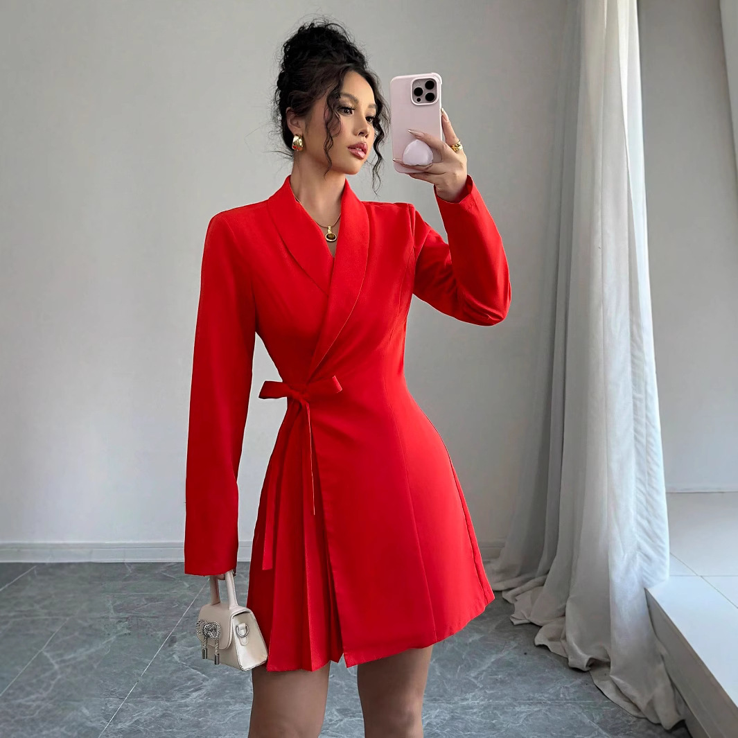 D340外贸大码女装2025新款时尚西装领时尚绑带收腰压褶非洲连衣裙