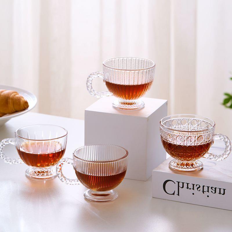 高颜值咖啡杯碟复古浮雕玻璃杯耐高温透明茶杯中式轻奢风杯子套无