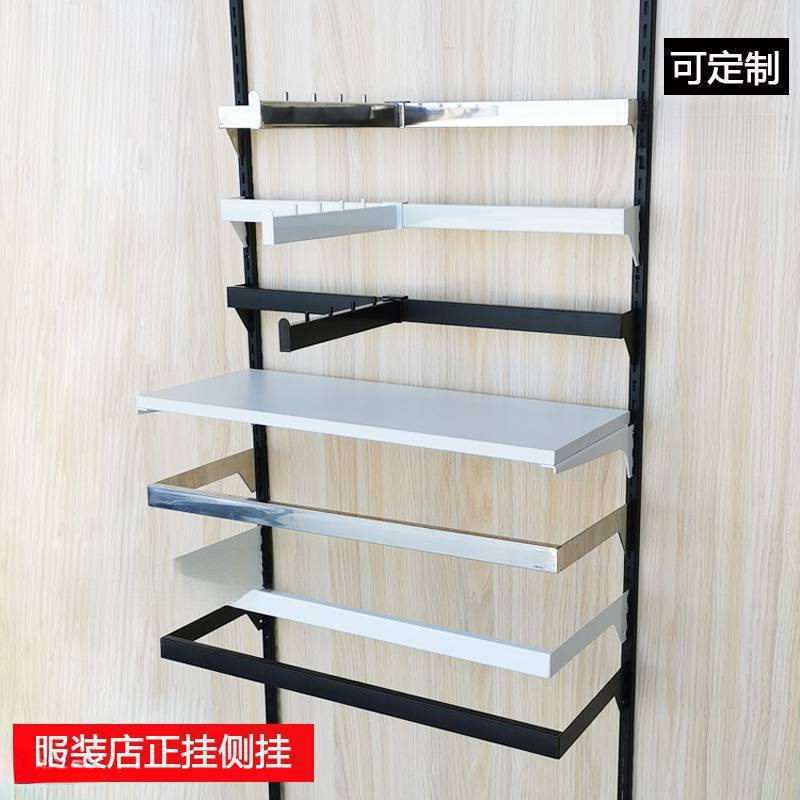 。 黒と白の衣料品店の壁に掛けてディスプレイスタンドを掛けています。ステンレス鋼のサイドハンギングAA柱はしご柱棚ラックホルダーです。