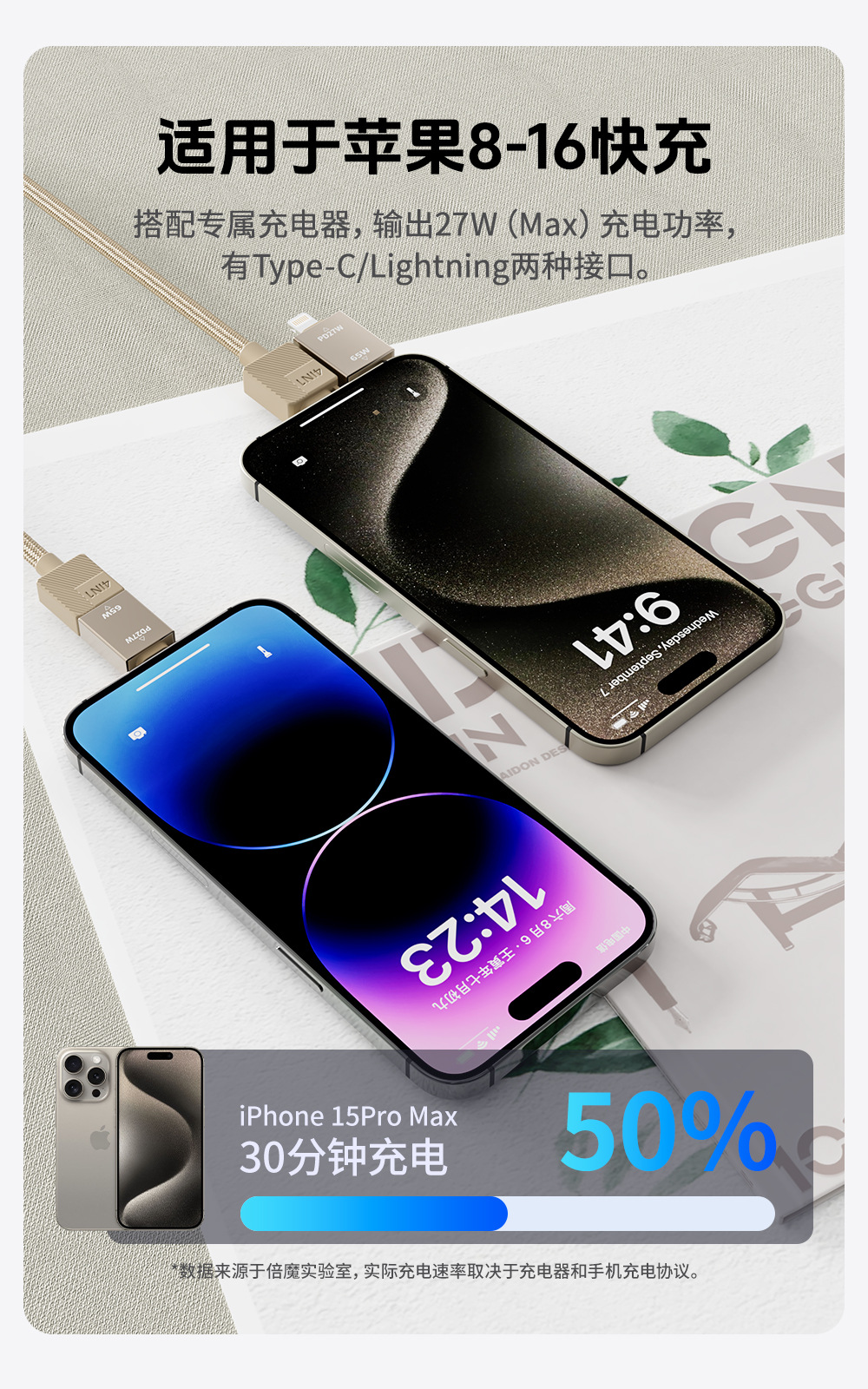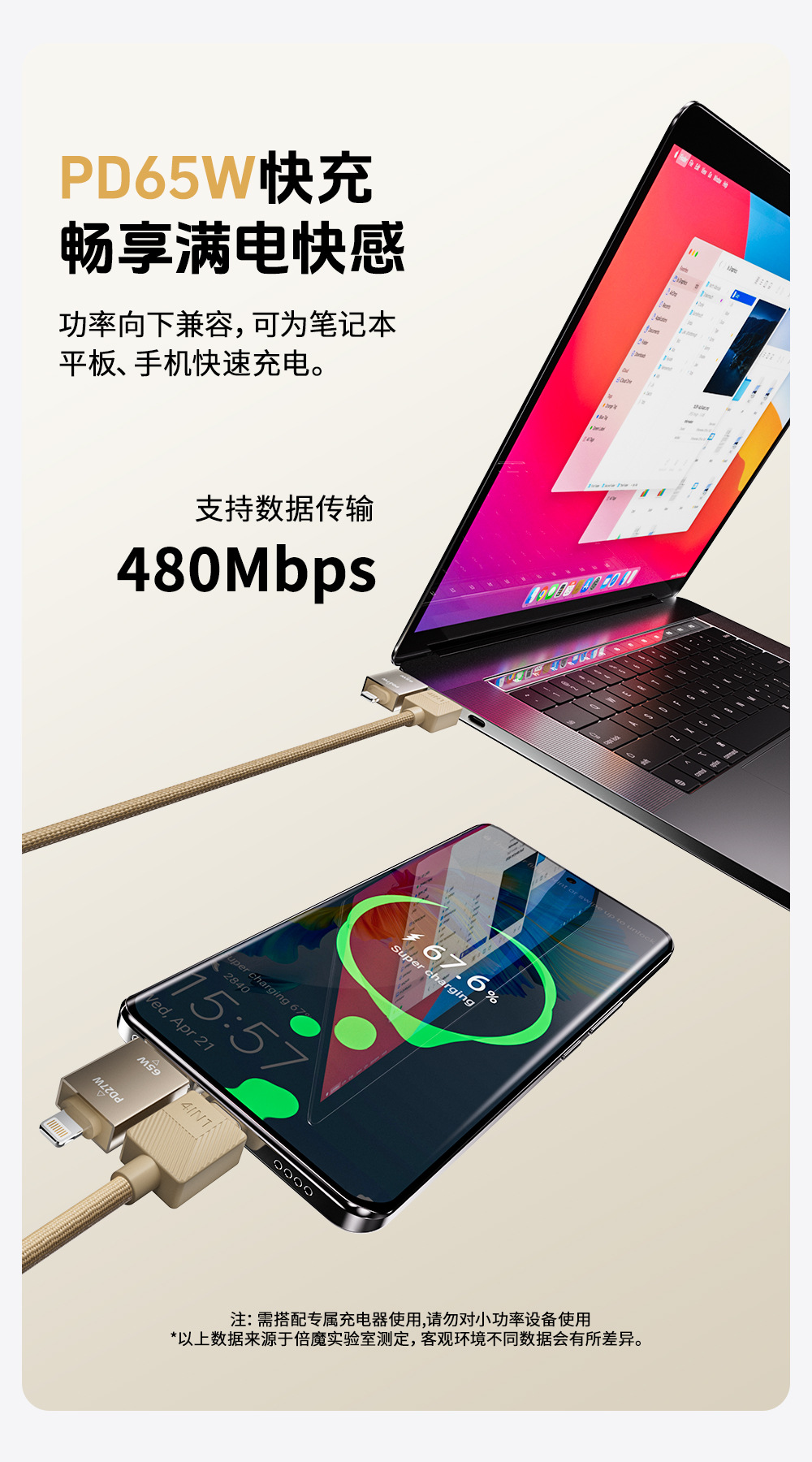 【真PD65W + 27W】倍魔光柱ばね四合一速充データケーブル2m適用リンゴ16華為