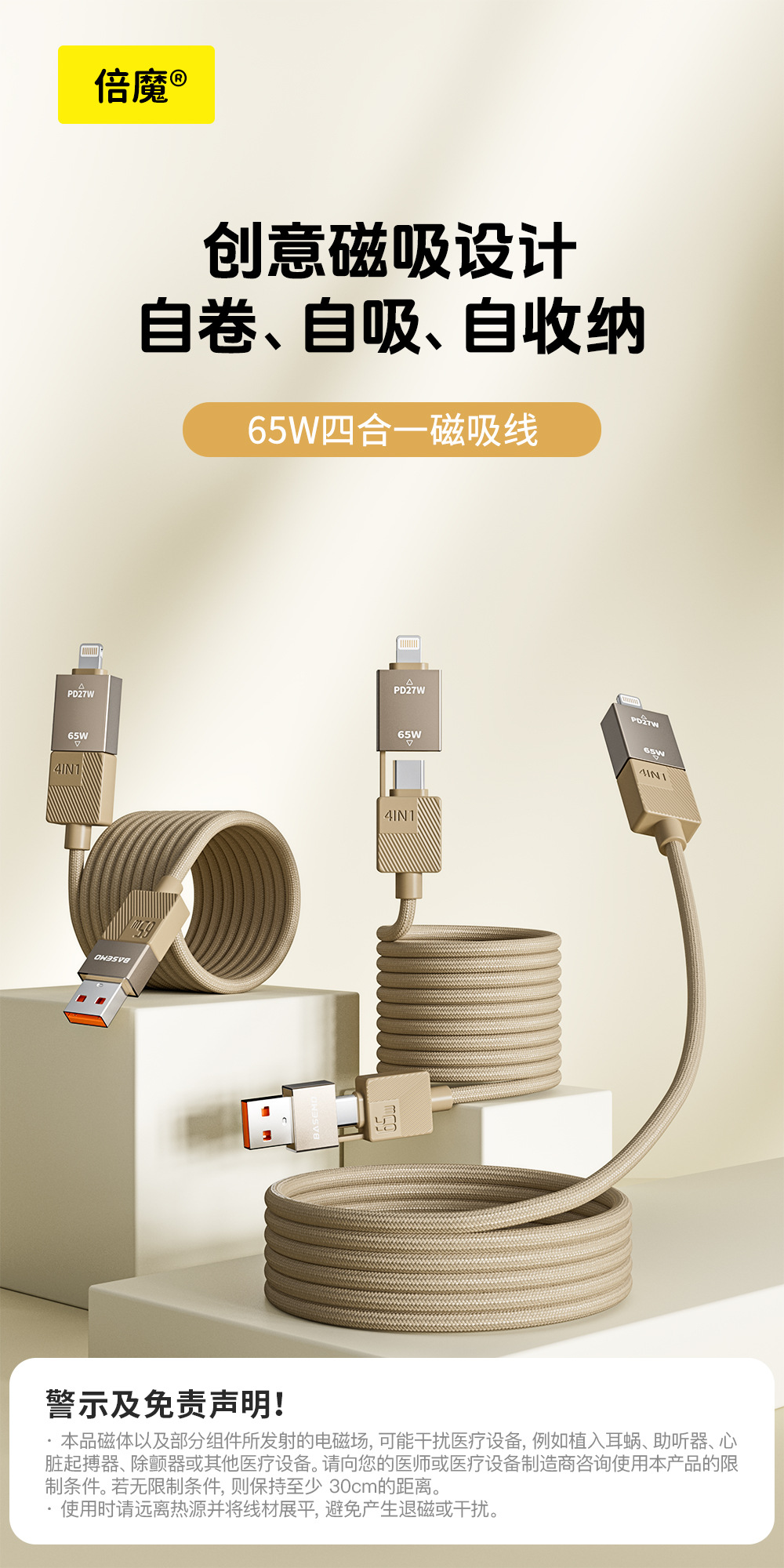 【超急速充電】倍魔4-in-1磁気吸着65W、Huawei PD急速充電対応、Apple 16対応編み込み急速充電ケーブル。